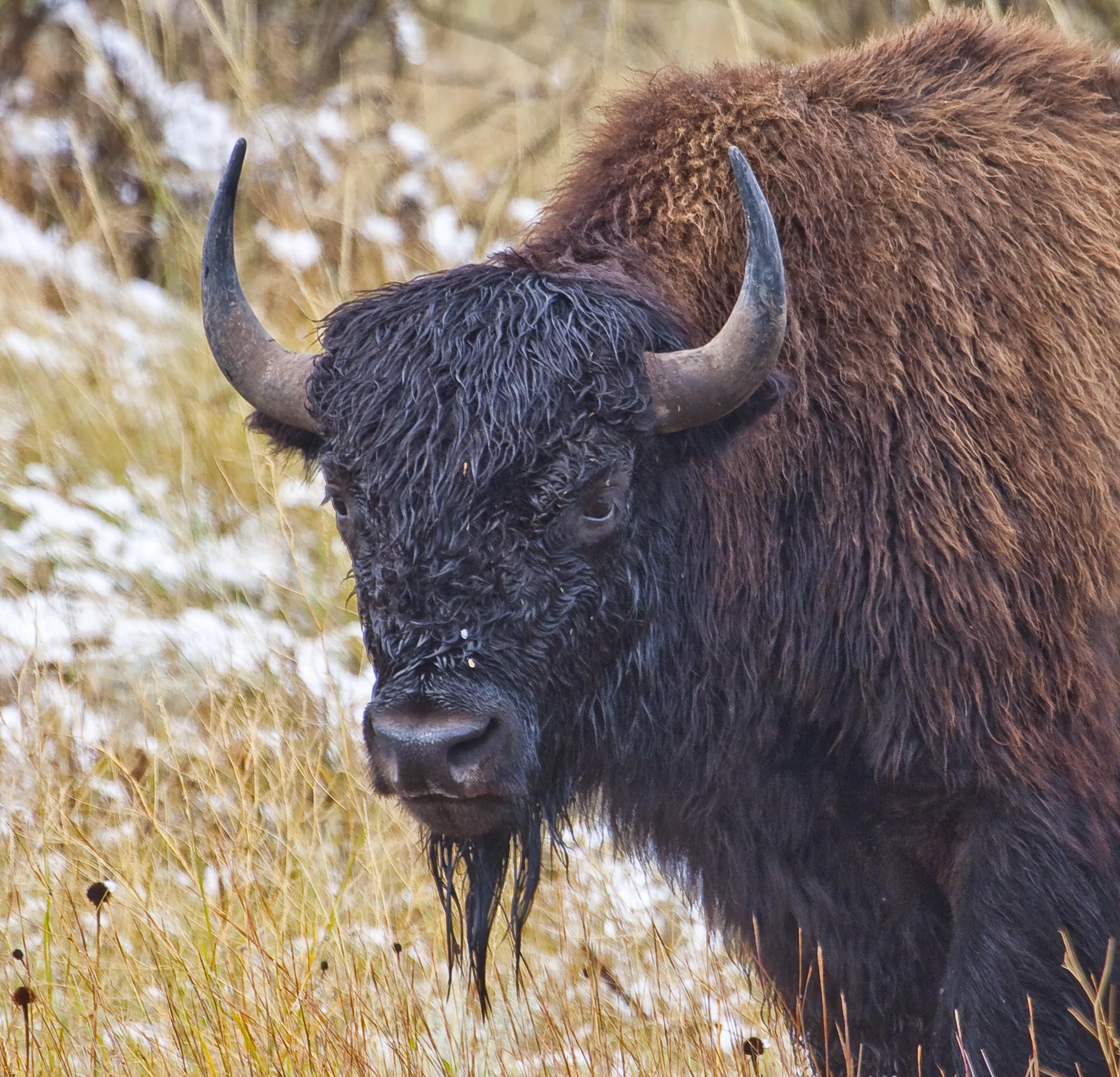 Friends, this young bison bull is ready for the winter winds to blow across the prairie and encase the land in ice and snow. Even though the wet snow of this first winter storm has melted all over him, he is still ready to take on all adversaries, even the larger bulls. His horns have not yet been torn up in battle and with his black head he looks rather menacing. I did not test his courage and after taking his picture, retreated to my vehicle. til Tomorrow MJ