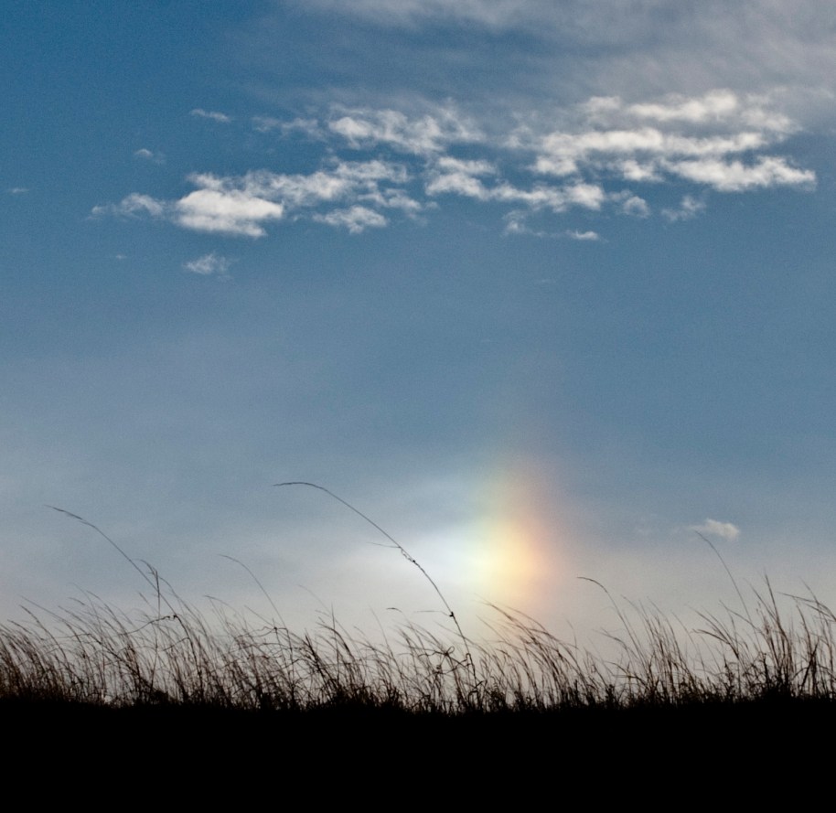 Friends, Sundogs are rainbows formed when ice crystals are in the air.  The hexagonal ice crystals act as tiny prisms and when falling vertically oriented appear as colored patches on both sides of a low-lying sun.  The cirrus  and alto-cirrus clouds may also suggest ice crystals and folk lore says that sundogs form when colder weather is in store. We saw this guy in the badlands of North Dakota so i included the grasses in the foreground to show the wind, that always seems to blow in ND. til Tomorrow MJ