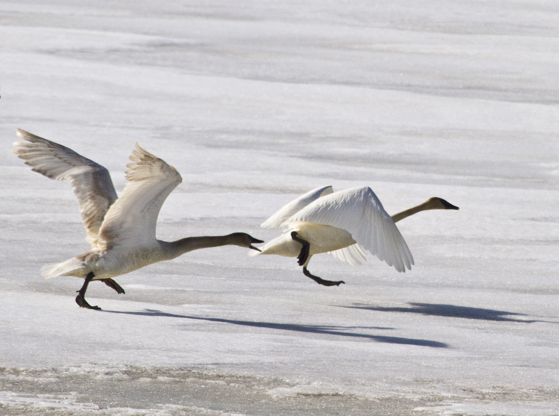 Friends, The ice (and snow) are still on the lakes and covering Crex Meadows, but the Trumpeter Swans return anyway cause they know it is nearing time to nest. Last spring, we watched a pair of swans build a nest in Crex, lots of pulling up vegetation and piling it on a muskrat house. When they first return a lot of chasing behavior establishes the area boundaries and eliminating possible competition for mates. This specie was almost extinct and has rebounded well in the last few years. Lead poisoning is still the biggest threat so please make sure your fishing weight is secure and doesn’t land in the bottom of the lake. til Tomorrow MJ