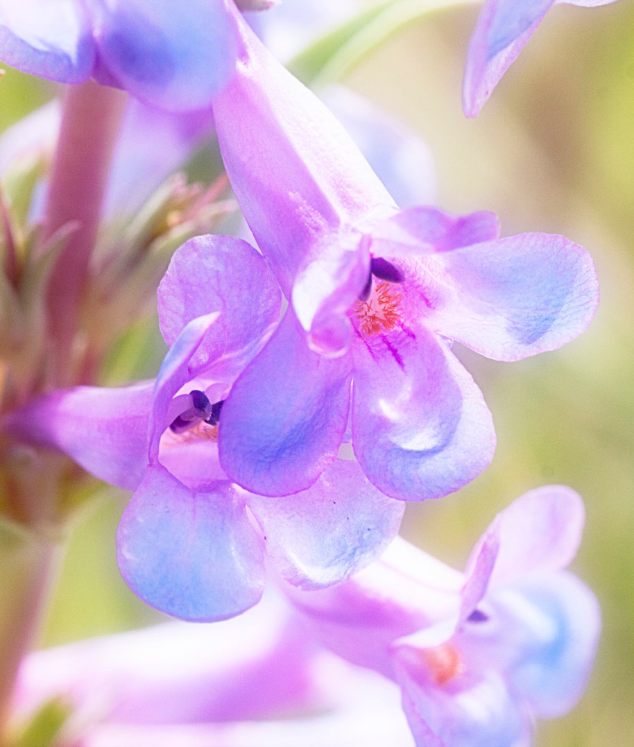 Friends, this tiny bloom of the badlands can’t decide whether it wants to be pink or blue, so when it first opens it is a mixture of these two colors.   When the bloom has been open for a few hours in the spring sunshine, it is bright blue.  The fifth stamen (pentstemon) is orange, densely- covered with hairs and this flower is often called a beard tongue.  The red lines on the lower lip of the bloom is thought to guide pollinating insects inside to the treasures within.  I am experimenting with high key images (over bright) to convey the spring sunshine effect with this macro shot.  I like this effect, how about you? til Tomorrow MJ
