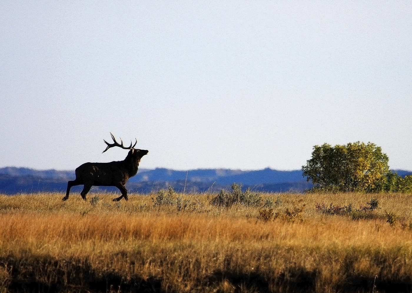 Friends, In the fall after his antlers are polished, this male elk runs the ridge top in search of a harem of cows.  Males lose these antlers in the late winter and grow a new and bigger set in the spring and summer.  The Rocky Mountain Elk have been transplanted to the park after being extinct from the badlands.  Now they thrive within the Theodore Roosevelt National Park where they are protected.