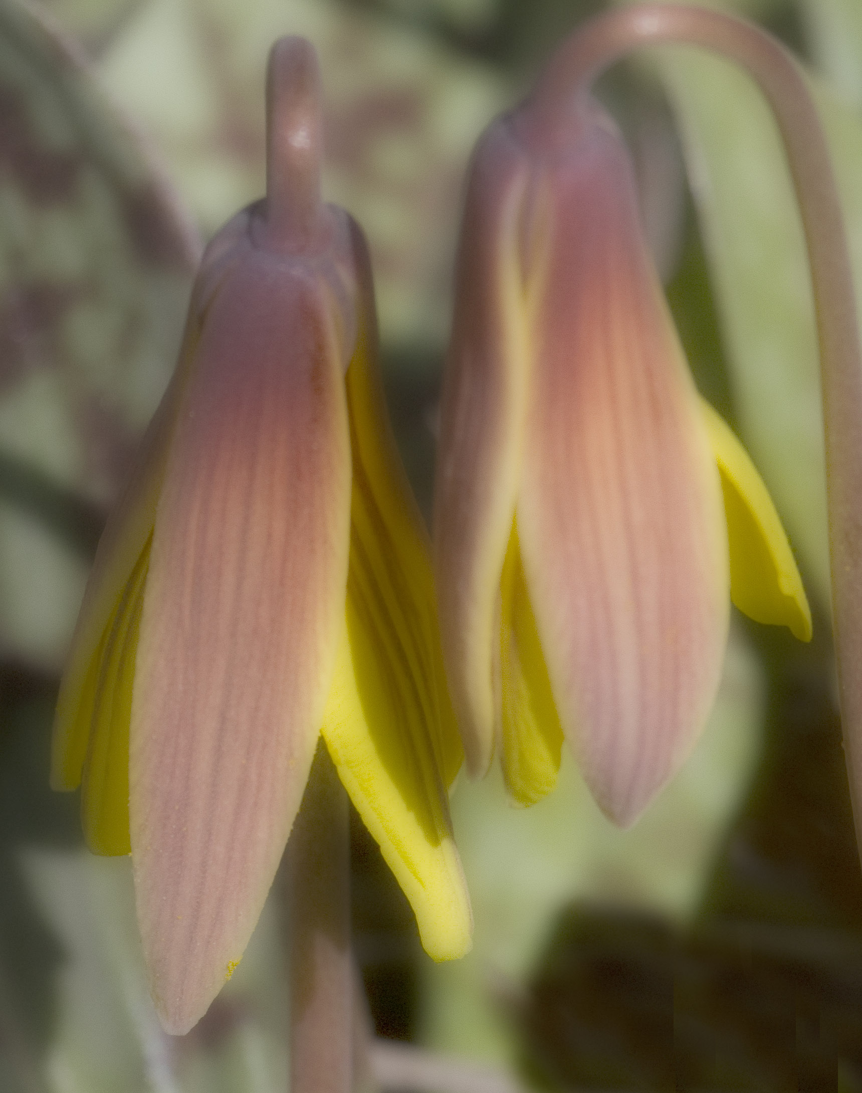 Friends, this tiny bloom is the trout lily that blooms early and in wet places. I did a macro approach to these blooms with the mottled leaves in the background, but the harsh reflections didn’t fit the image. Lately i have been reading a photo book, “The Softer Side of Macro” by Denise Ippolito. She talks about the Orton Effect , a photoshop technique that she uses on flowers. This trout lily blooms were Ortonized and I really like the softening effect but don’t like the dark background, need a high key image to try, maybe tomorrow. Stay tuned while i learn a new technique. Her Book is available as a pdf ebook on the Birds as Art website. Check it out, I did. Below is the second edition of trout lilies with the Orton effect. Am i improving? and to all Moms out there, Happy Mm’s Day til Tomorrow MJ