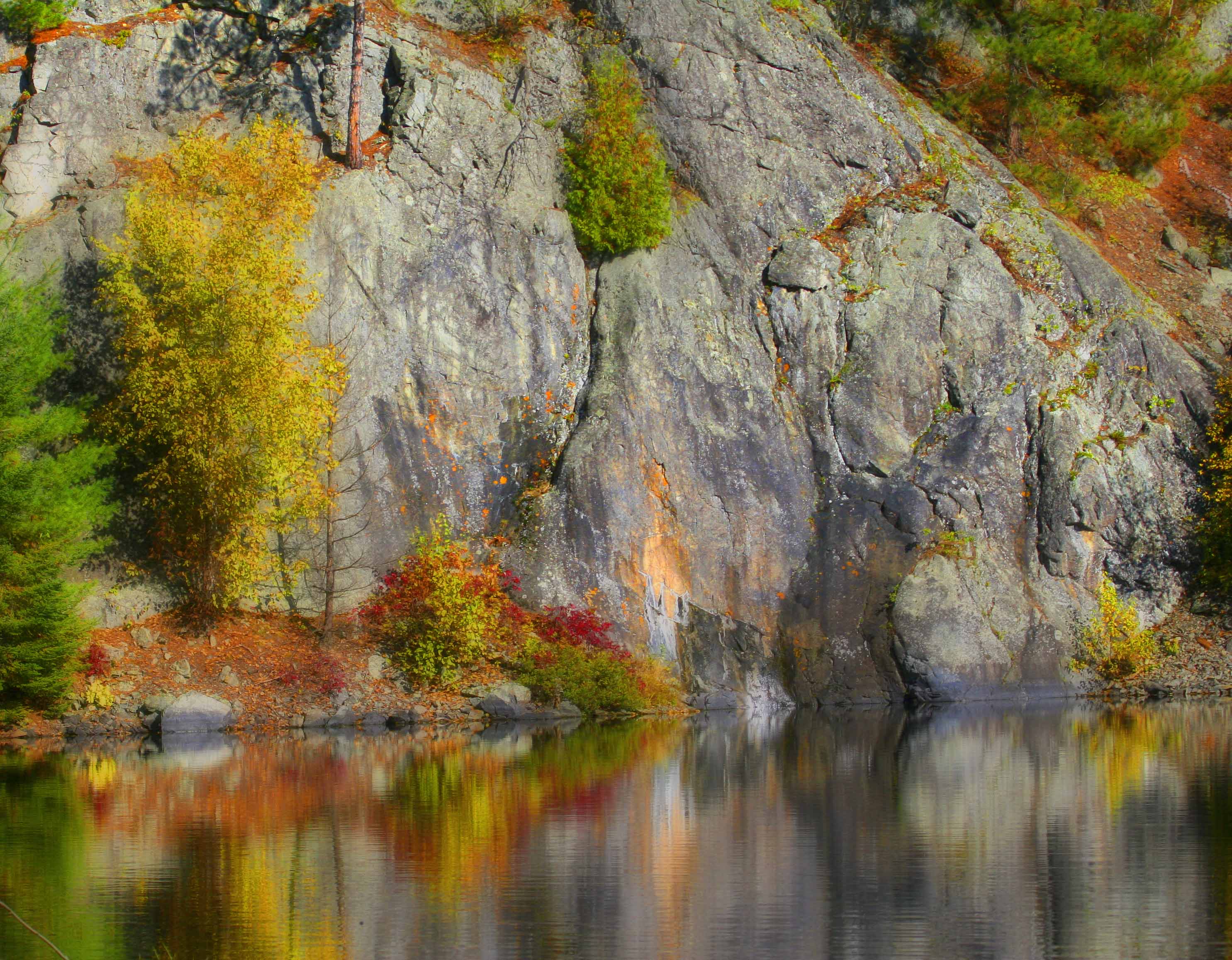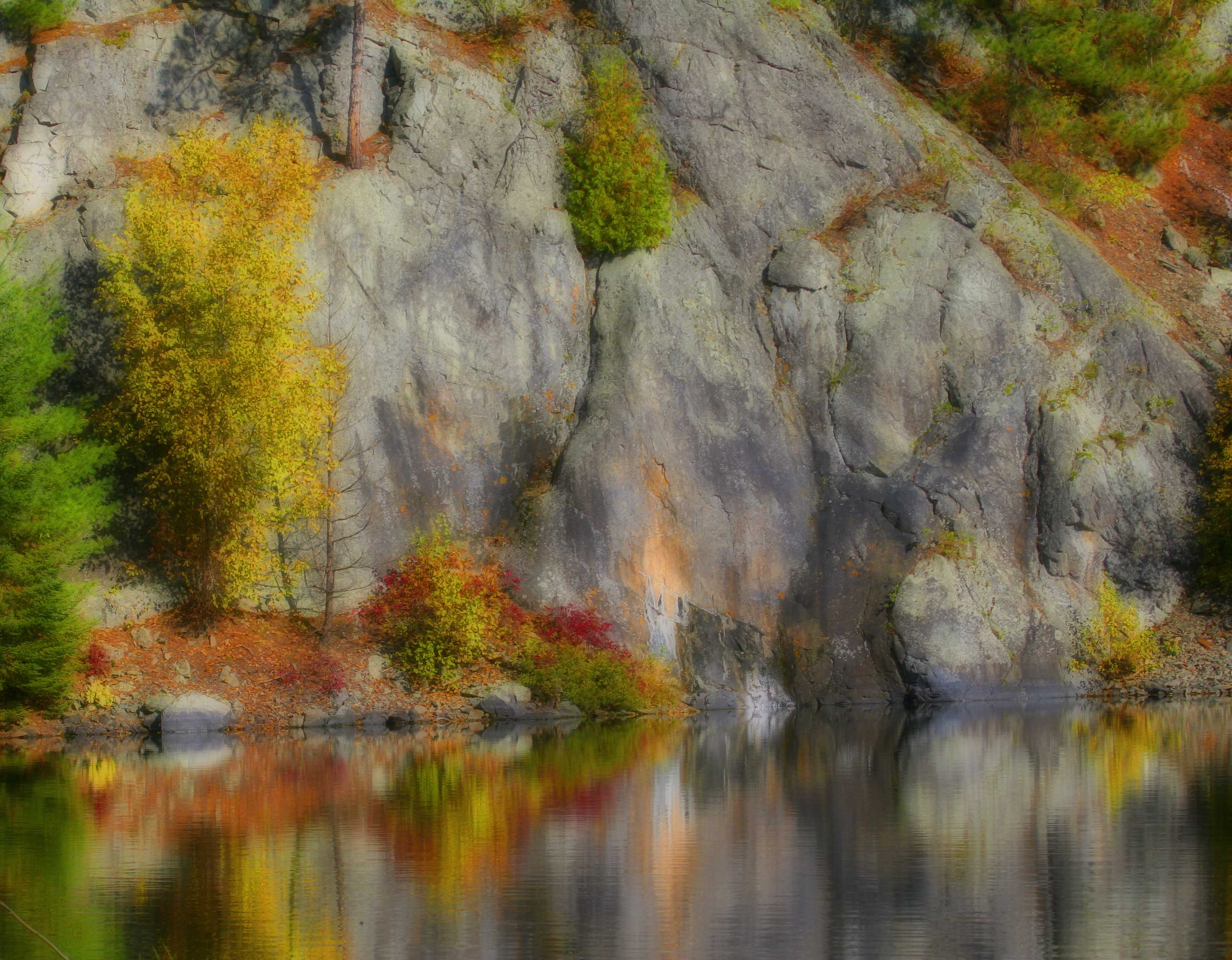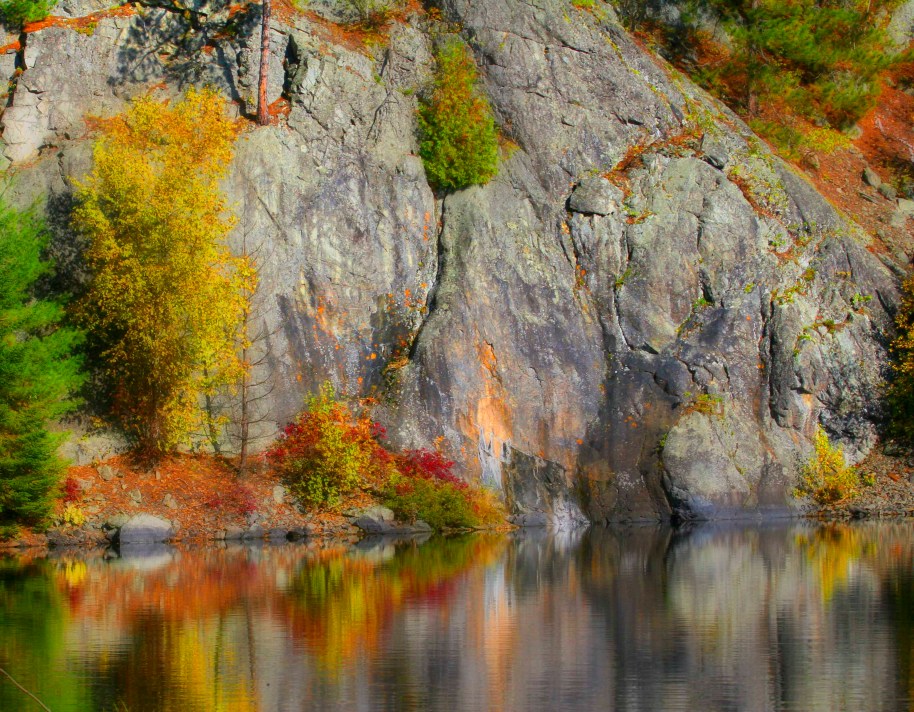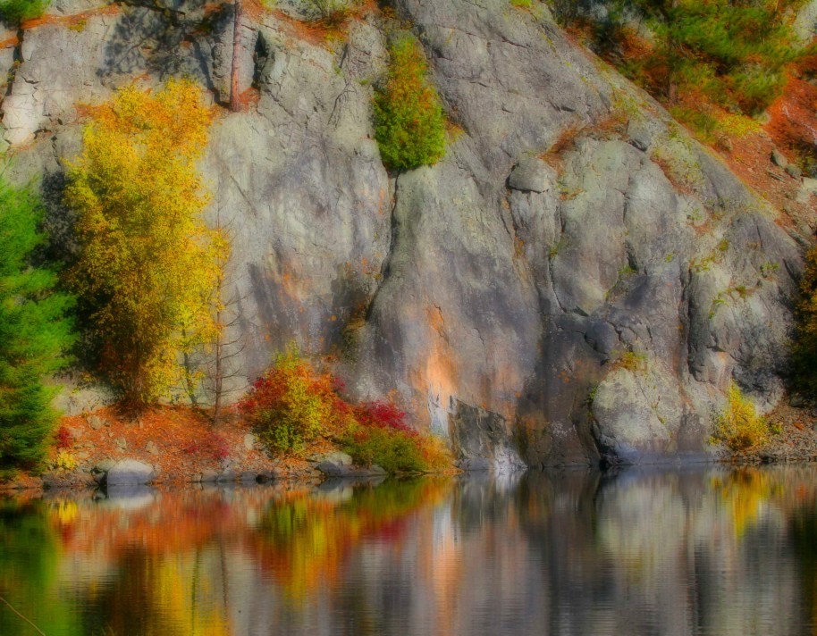 Friends, this image was taken in the Boundary Waters in Northern Minnesota.  This area is famous for canoe trips thru wilderness lakes. The fall foliage and massive granite rocks make a good contrast and i loved the reflections. Now to experiment, the Orton Effect on the omage below, what do you think the original or the ortonized image? Or the third option which is a mix of the two sharp and soft images, What do you think?  i entered this in a reflections challenge, it can be  found at http://wheresmybackpack.wordpress.com/2012/05/12/reflections/ til Tomorrow MJ