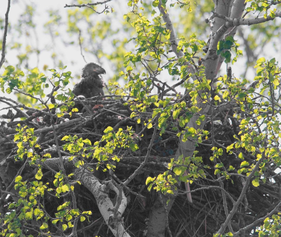 Friends, please excuse the rotten picture, it is strictly for documentation as  this nest of bald eagles is always backlit when we visit.  We have been watching for the chicks to appear and this ugly mutt showed up in the nest.  He sure isn’t cute and cuddly like other baby birds. But he is an immature eaglet that mama and papa eagle are feeding.  This image makes me laugh because his bill looks like it is too big for him.  The nest is well made of huge sticks and woven quite well considering that it was done by a bird.  The adult birds labor to bring these sticks to the site and patiently build from scratch or build on last year’s platform.  Last year we had a tremendous wind storm (tornadoes) that knocked down many of the eagle nests around Crex Meadows so many of the birds had to build nests anew.  til Tomorrow MJ