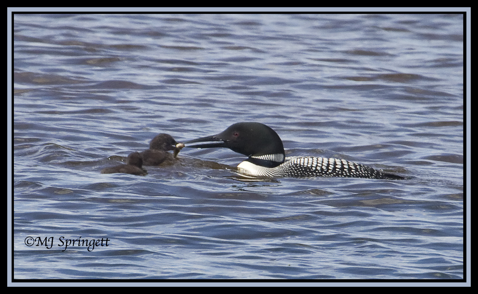 Friends, this loon parent is feeding his/her chicks, the fish is as big as the chick, no wonder those chicks grow so fast. I watched while mama loon carried the chicks on her back and at 3:30pm she called to the male, soon the male appeared and both parents dove below the surface finding food to feed the chicks.  They put on quite a show but i was stretching the limits of my telephoto lens to record these proceedings.  I have gone back on two other occasions but they have moved out to the center of the lake.  This image is a little lacking in quality but does show the “decisive moment”. til Tomorrow MJ