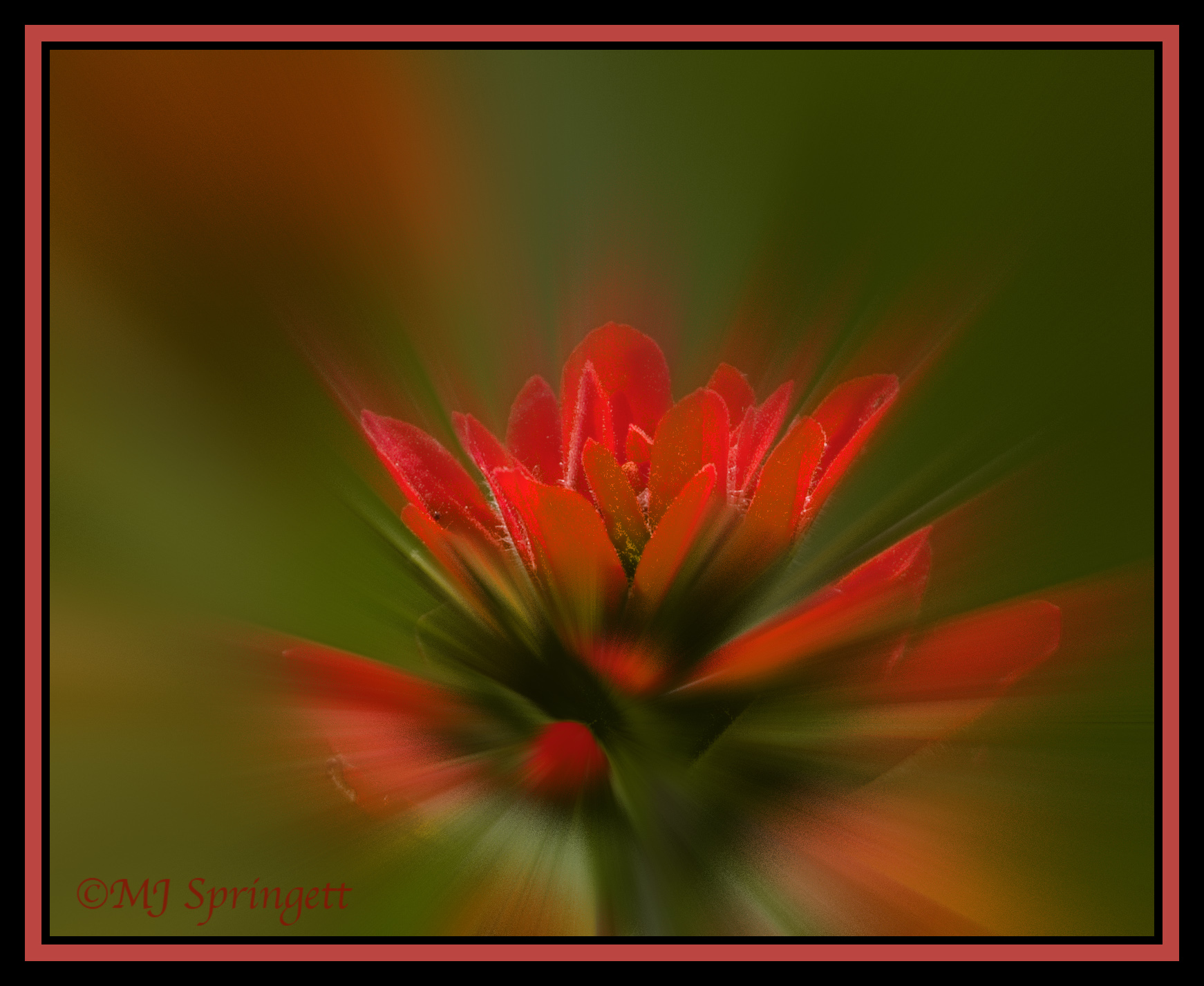 Friends, this is the Indian Paintbrush flower, getting tired of my mundane flower shots so I am experimenting with radial blurs.  This effect can be captured in-camera by twisting the zoom barrel while exposing.  Since I had already taken this image in the field, I chose to add a radial blur in photoshop.  I really love photoshop and learning new skills.  What do you think?, you can sign up for  this newsletter in the column at the right, I blog every day and try to photograph every day, especially in the warmer months. til Tomorrow MJ