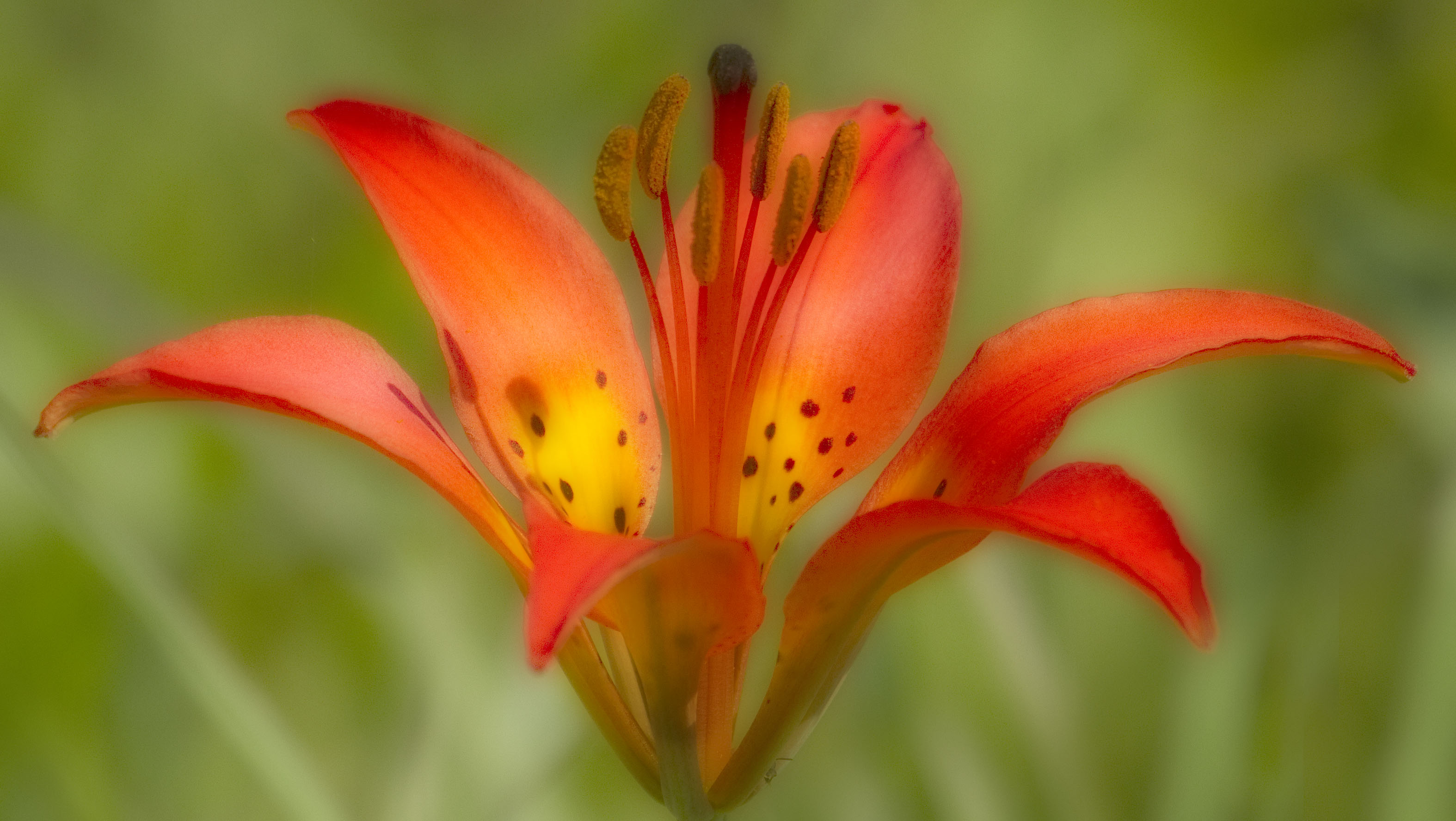 Friends, In Crex Meadows the wild Lilies are blooming here and there on the prairie grasslands.  Their bright orange attracts the eye and my camera.  These are a bit different than the domestic day lilies in that the cup where the petals meet are not closed and each petal is separate from the others, six beautiful orange petals with spots.  I didn’t like the glare from the full sunshine so i used the Orton effect to soften the image.  Thanks to Denise Ippolito and her book “The Softer Side of Macro”, well worth the read for you wildflower fans. til Tomorrow MJ
