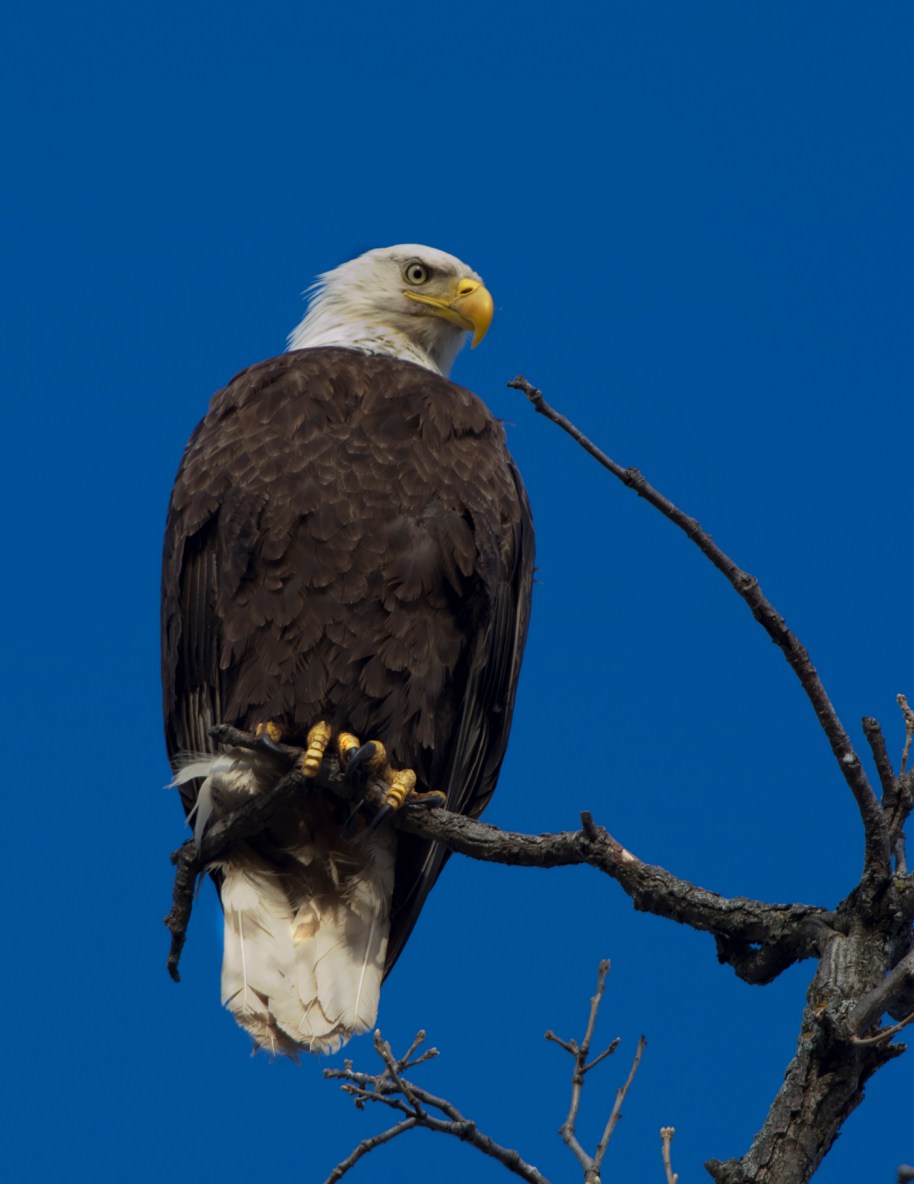 Friends, this mature Bald Eagle is staring down at me, Against the clear blue skies that we get sometimes in the early spring, he is a regal image.  I had to work hard at getting the exposure right as his white feathers often overexpose and the details are lost.  I had no blinkies in this image so the exposure must be right, Is there right and wrong in art? A question of taste, but technically must be right.  The scientist in me must be satisfied and also the artist, both sides of me are satisfied by this image.  til Tomorrow MJ
