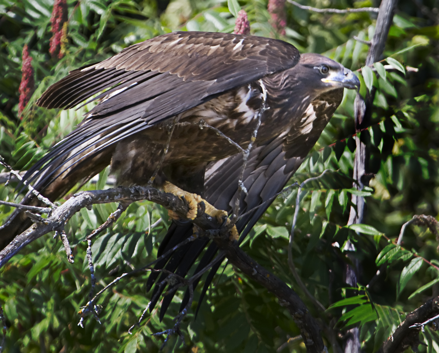 Friends, I have been visiting the Bald Eagle nest in Crex Meadows since April, today the chick was twenty feet down from the nest and when i was taking his portrait he decided to fly away.  Straight down the waterway and away from my camera.   I know it is not the best shot but it is a documentary shot to mark his freedom from the nest.  He was getting pretty bored up there and needs to learn to hunt for himself.  He was sitting on this branch and checking out the activity in the water below. Won’t be long before he is bringing home his own bacon. til Tomorrow MJ