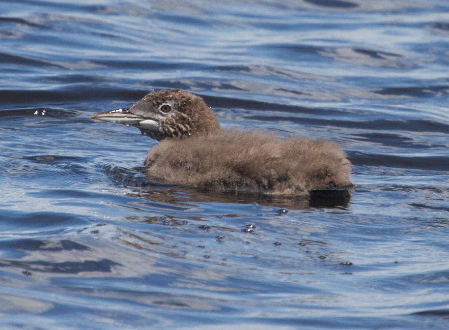 Friends, this loon chick is about 5 weeks of age and spends most of his day floating on the water waiting for one of his parents to feed him.  He is still covered with lots of fuzz but has started to shed his fuzz on his head. He is starting to look like a real loon.  The tiny bubbles in the foreground are all that is left of the parent who brought the chick food and then dove out of sight.  til Tomorrow MJ