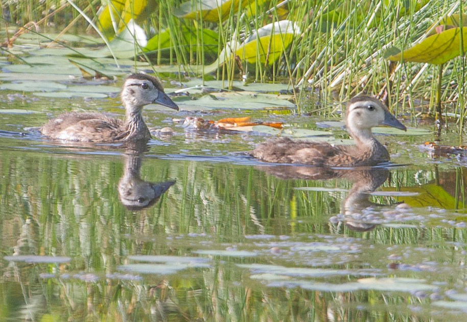 Friends, these baby ducks are young wood ducks, teenagers who are eating all the time, when i drove up and pointed my telephoto lens at them, they ran for mama who was around the corner eating wild rice seed, the black strip behind the eye is the defining mark of young wood ducks and their coloring this time of year serves to hide them well, we are still very green but some of the lily pads are turning fall color, til Tomorrow MJ