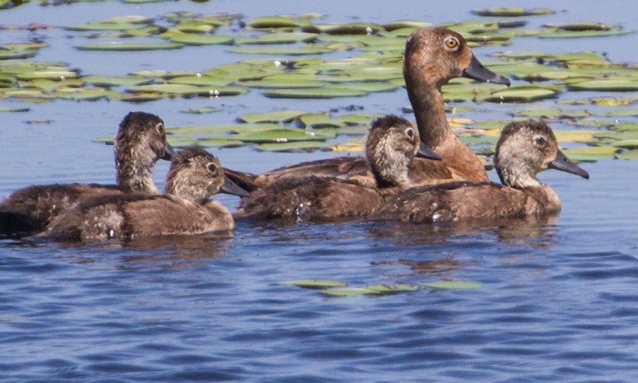 Friends, on a hot july day, these baby ring-necked ducks are going for a swim with mom, some call these ring-necked and some call these ring-bills, but this time of the year both the rings are fading away into a summer plummage.  The rings are still there but very faint like they have been bleached by the harsh sunshine this time of year.  I prefer the name ring-billed cause ring-neck in this part of the country usually refers to a pheasant.  Another 95 degree day in the northland. til Tomorrow MJ