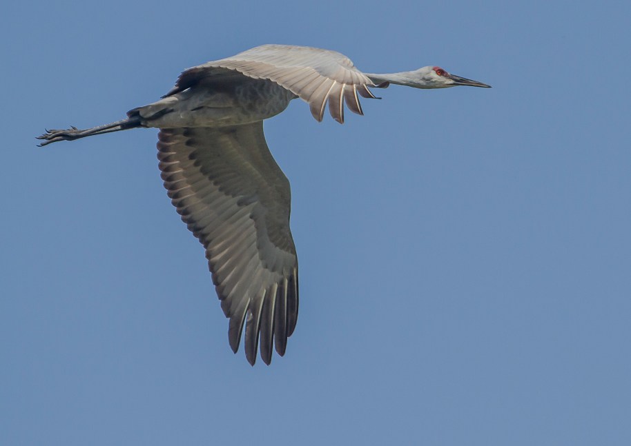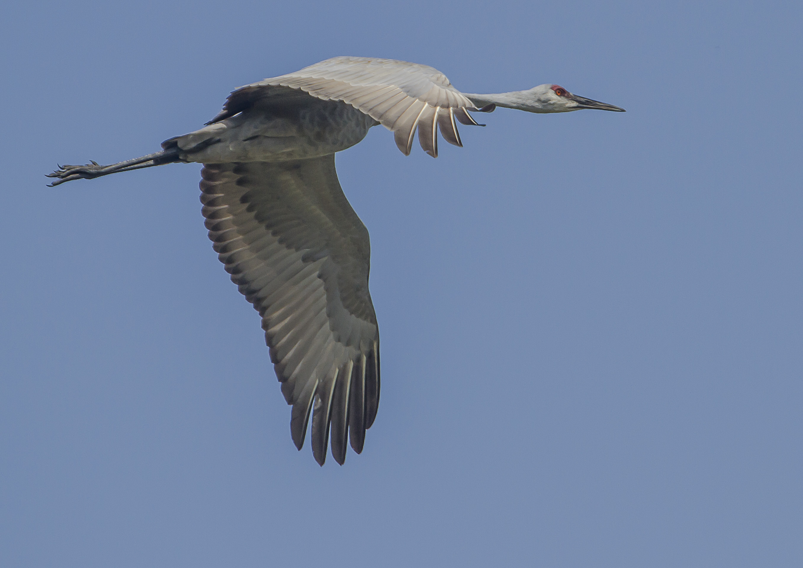 Friends, this Sandhill Crane has either just molted into his formal gray or has arrived from Northern clearer waters.  He is a clean gray and not stained red from the iron-rich waters of Crex.  I found lots of molted feathers around the feeding fields of Crex which suggests that the Cranes are molting and shedding those red worn feathers.  Some of the feathers are gray at the base and red on the outer tips.  The Cranes are flying about getting ready for the Great Fall gathering on the marshes of Crex. I am practicing my flying shots so I will be ready for the fall migration that is the highlight of my year at Crex.  Thousands of cranes concentrated on a few marshes flying into a roost in the evening and out of the roost at sunrise is a sight that should not be missed by any bird/nature lover.  They will soon be everywhere in Crex Meadows of NW Wisconsin.  til Tomorrow MJ