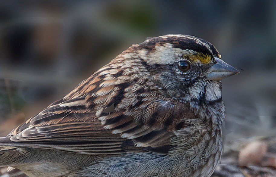 Friends, this tiny bird is a white-throated sparrow visiting Hawk Ridge sometime in October.  I love the little yellow spot in front of his eye, the image below is a close-up of his head.  You can see the new bracelet that the banders have given him .  Some of these little birds are captured more than once cause they tend to hang around the bird feeders.  Lots of birds follow Hawk Ridge on their migration routes, so maybe Hawk Ridge should be called Bird Ridge.  Just kidding of course, the more spectacular birds always bring the crowds. til Tomorrow MJ