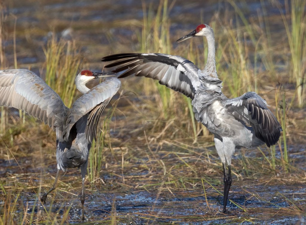 Lots of crane dancing going on right now in crex meadows. This one is spreading his wings to confront the bird on the left. The light was strong but that was necessary to freeze the action. Enjoy til tomorrow Mj