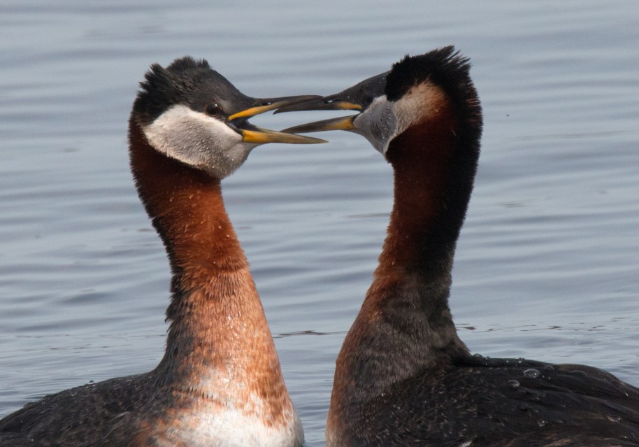 Dear Friends, this pair of red-necked grebes are courting on Phantom Lake. At this point they have built four different nests and lost them all, they are currently sitting on another piece of floating dirt in the middle of the lake. They may or may not have an egg. I will keep you apprised. til Tomorrow MJ