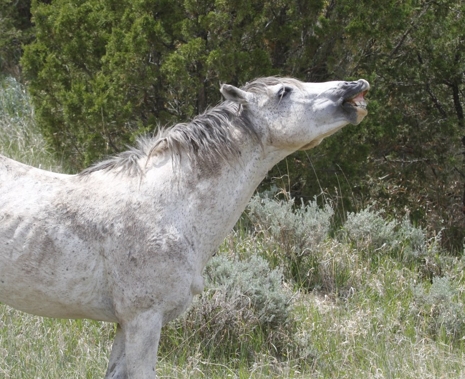 Friends, these two handsome guys are both rolling their upper lip in response to a smell. This is called the flehmen technique, and stallions quite often exhibit this behavior when a mare is in heat. These two stallions are unique in that they run their mares together in one group. The top one is Singlefoot and the bottom image is Redface. There is sometimes some squealing when they meet head to head, but the dispute never seems to come to blows. til Tomorrow MJ