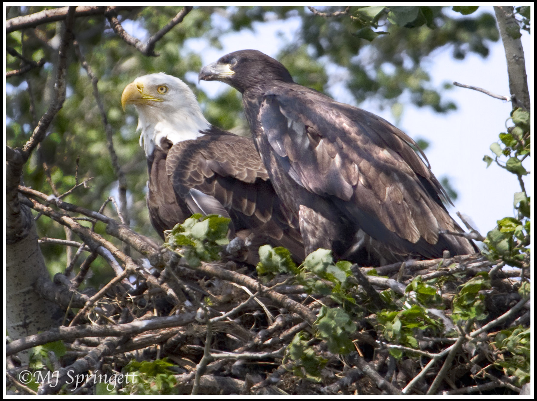 Friends, this a mature Bald Eagle with her chick of this year are sitting on the nest. I have been following the chick progress since about early May, now the chick is getting ready to fly. When both adults are on the nest with the chick, there is peace and harmony, but when the adults leave him alone, the chick jumps around the nest and spreads his wings to make them strong. The bottom image is a composite showing that he is getting lift from his powerful wings, soon he will take flight, maybe today, since the wind has diminished from the 40 mph gusts of the last two days. til Tomorrow MJ