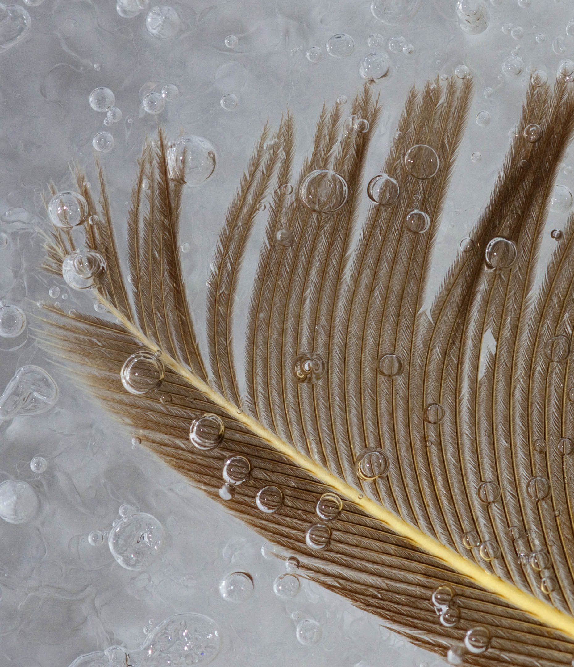 Friends, more bird (Northern Flicker) feathers in ice. Using the same technique as in a previous post these feathers were frozen in ice. In a single image, the whole field was not focused as the feathers were on different planes. Multiple images (8) with different focus points were taken and combined as layers in a single photoshop image. Briefly all the layers were selected and the two commands auto-align layers and auto-blend layers were run sequentially from the edit menu. This process combines the images with layer masks that only allow the focused region to be part of the overall image. I love the bright yellow shafts and the small details that show up in the feathers and in the ice.