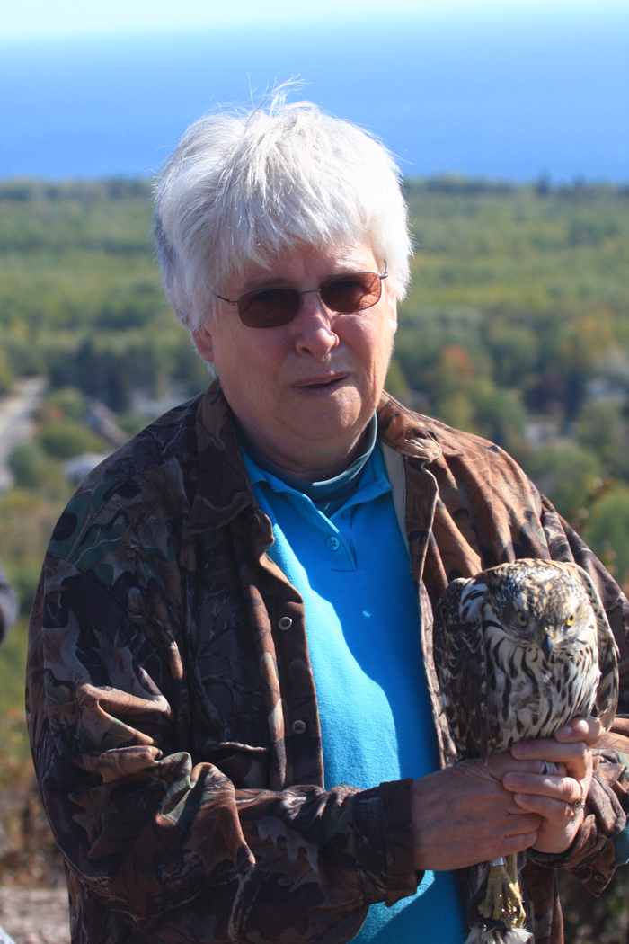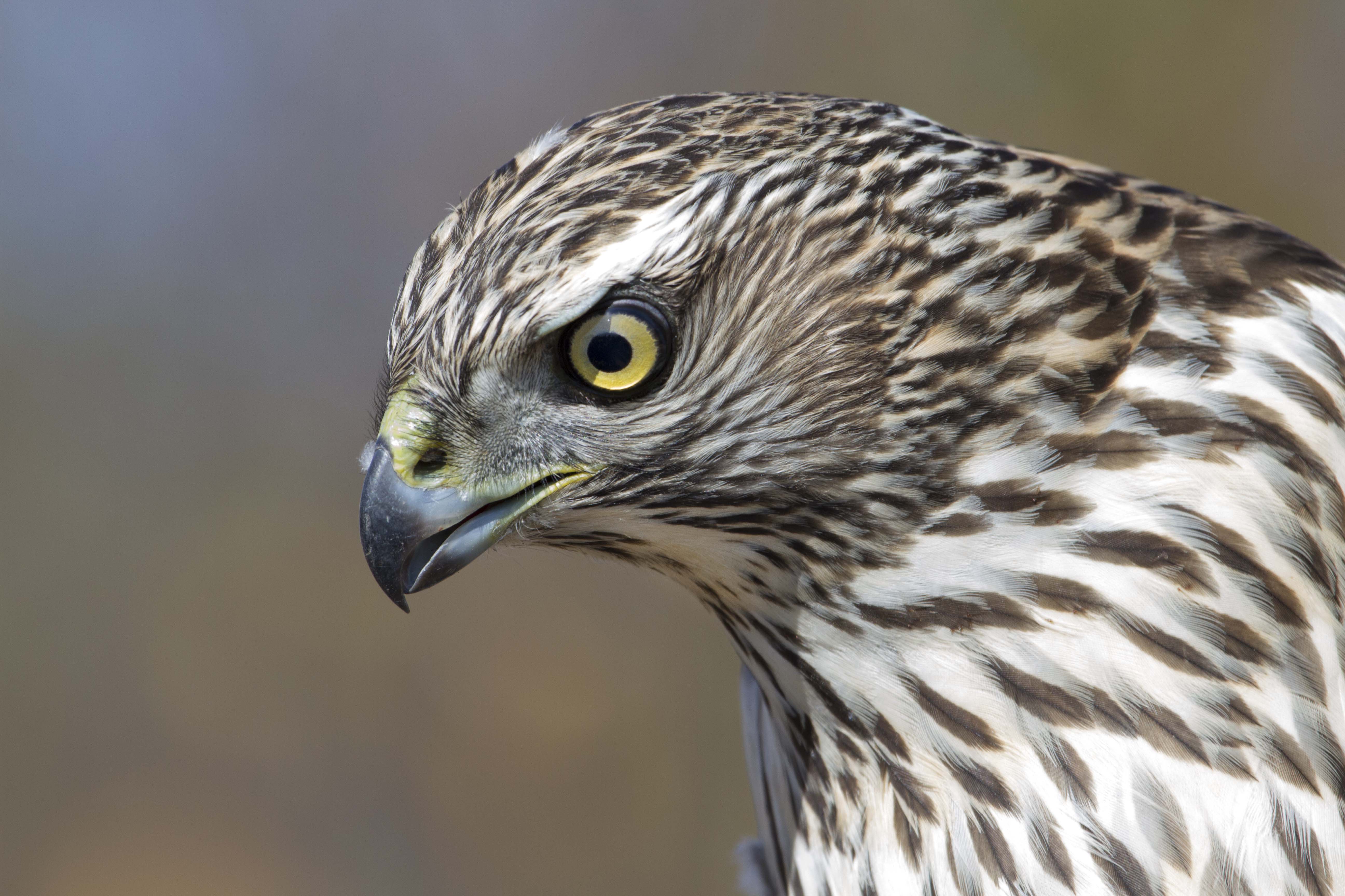 Friends, this image is an immature Cooper’s Hawk compared to an adult shown below. They are larger than their cousin the sharp shinned, but smaller than their other cousin, the Goshawk. Like their cousins the hatch year birds have yellow eyes, vertical chest feather pattern and chocolate brown back feathers. When they grow to adult birds, the eyes turn to red, the chest pattern changes to a more horizontal pattern and the back and head get a dark gray. Collectively these hawks are in the Accipiter group and in the air they have long tails and short wings so they can quickly maneuver thru the woodlands to catch their prey. The Cooper has a loose ruff of feathers on the back of the head that is sometimes raised, you can see this ruff on the adult bird below and a hint of it in the immature bird. Enjoy your coopers hawk until tomorrow when we release him back to the wild. til Tomorrow MJ