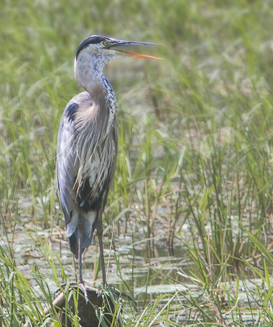 Friends, this Great Blue Heron is talking back and telling me that he didn’t like the heat of the day, actually he was panting in the 100 degree heat. A panting bird like a panting dog is trying to dissipate heat, he probably could get into the water to help cool his jets. His swollen neck suggests that he just had a rather large lunch and it is still lodged in his crop located in the neck region. The food is stored there and gradually fed into the stomach. He is perched on a rock so you can see his very large feet, good for traveling in mucky muddy footings of his everyday swamp. til Tomorrow MJ
