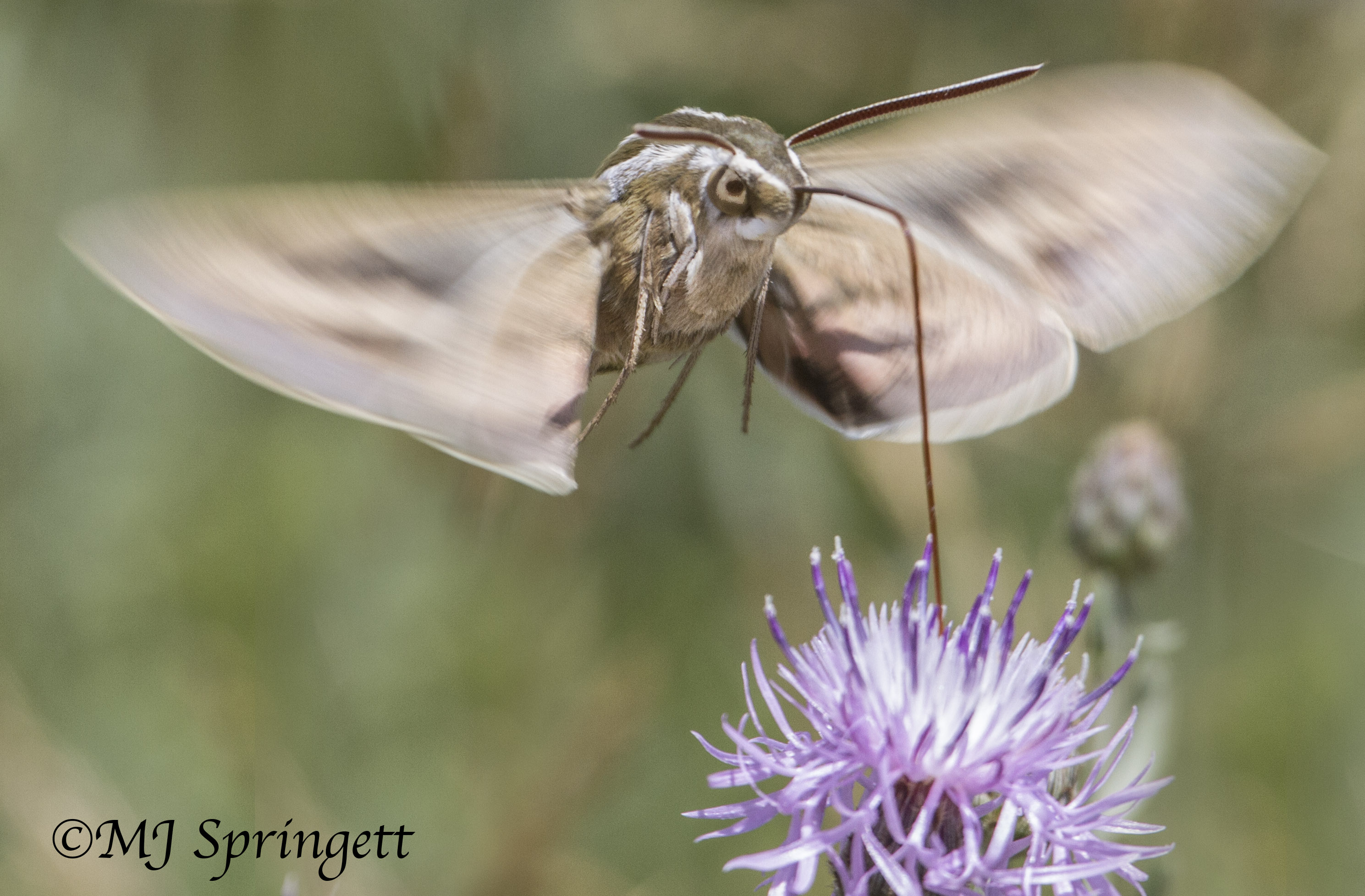 Friends, at first i thought it was a hummingbird, then a huge butterfly, but after closer examination I discovered that i was photographing a moth, a very large moth that hovers like a hummingbird and is similar in size, hence its nickname, the hummingbird moth, it drinks the nectar through a proboscis like a butterfly, a very long straw to drink its soda. Its real name is the white-lined sphinx moth. Below is the moth from the front. til Tomorrow MJ