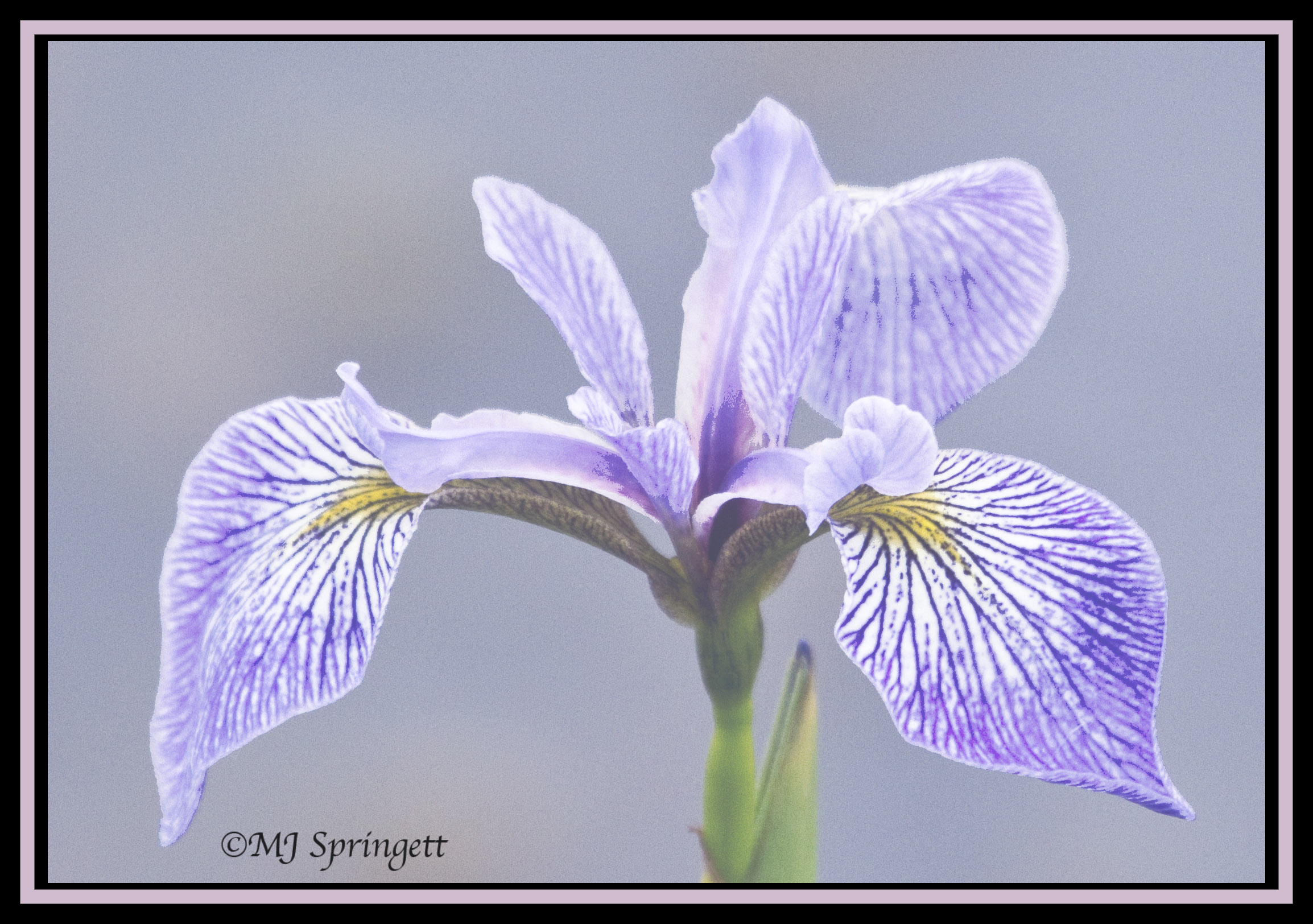 Friends, this blue iris or blue flag iris is difficult to photograph for two reasons. One is that nearly always is perched in a complicated green background and two is that the blooms are ravaged by bees, butterflies, dragonflies and hummers as soon as the blooms open. This unusually fresh bloom was found early in the day against a water background. What a find!! for a flower person. How do you like it ? You can subscribe to my blog in the column on the right. I blog every day so stay tuned, til Tomorrow MJ