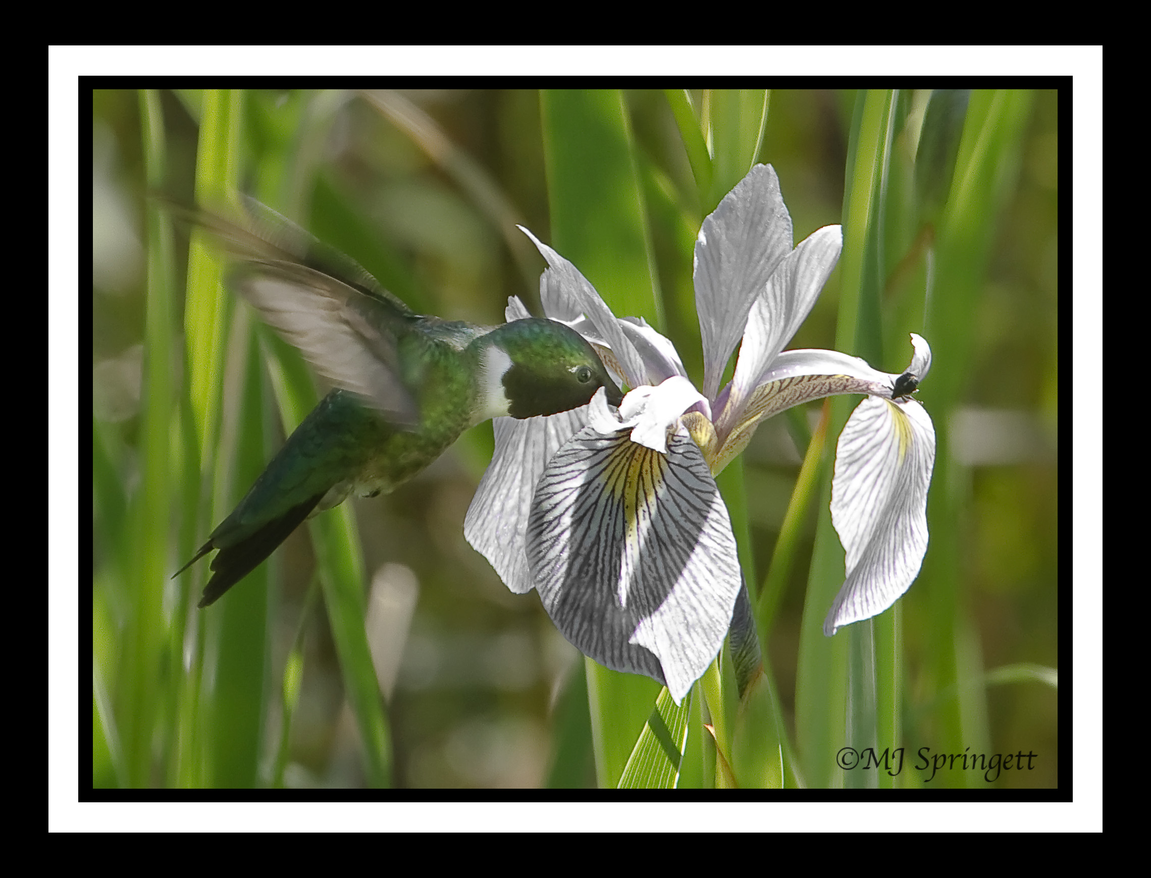 Friends, I call these wild Iris, the wild blues although when they have been out in the sun, they soon fade to a light blue or white. This ruby-throated hummingbird was jumping from bloom to bloom. He would periodically disappear into the willows and when he exited he flew above the iris in a u-shaped diving back and forth. I witnessed a male showing off for his girl. Although this shutter speed 1/1000 of a second is fast enough for most flying birds, hummers are too fast to freeze without special means. Their wing speed is 50 flaps/second and they do hum when they fly hence their name, hummingbird. til Tomorrow MJ