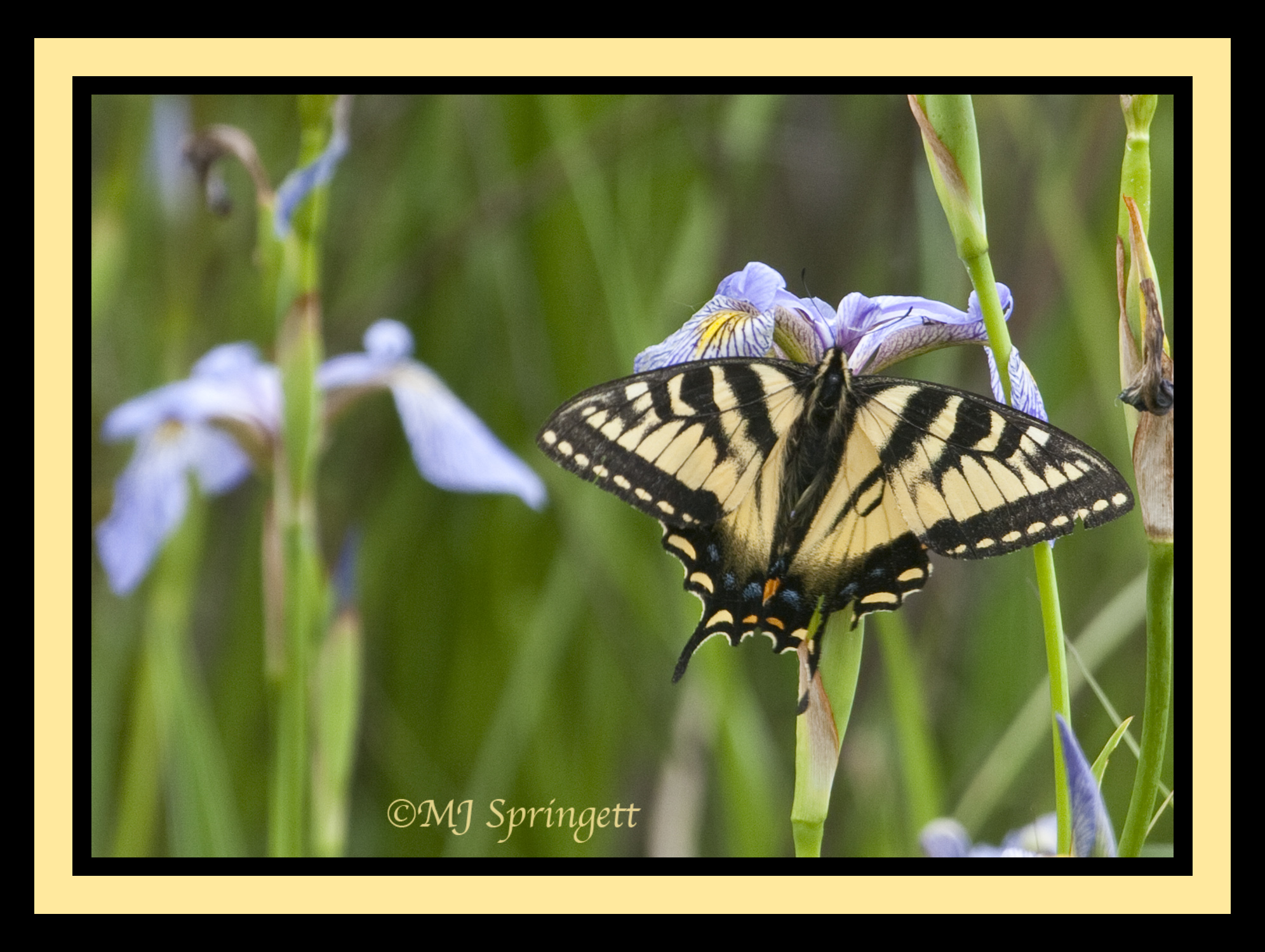 Friends, the top image is a pearl crescent butterfly with a wing span of 1.25 inches, very small but the orange dot on the end of the club-shaped antennae is the defining mark. The bottom image is a swallowtail that is much larger as seen on a blue flag iris, all of them wild, wild, wild. til Tomorrow MJ