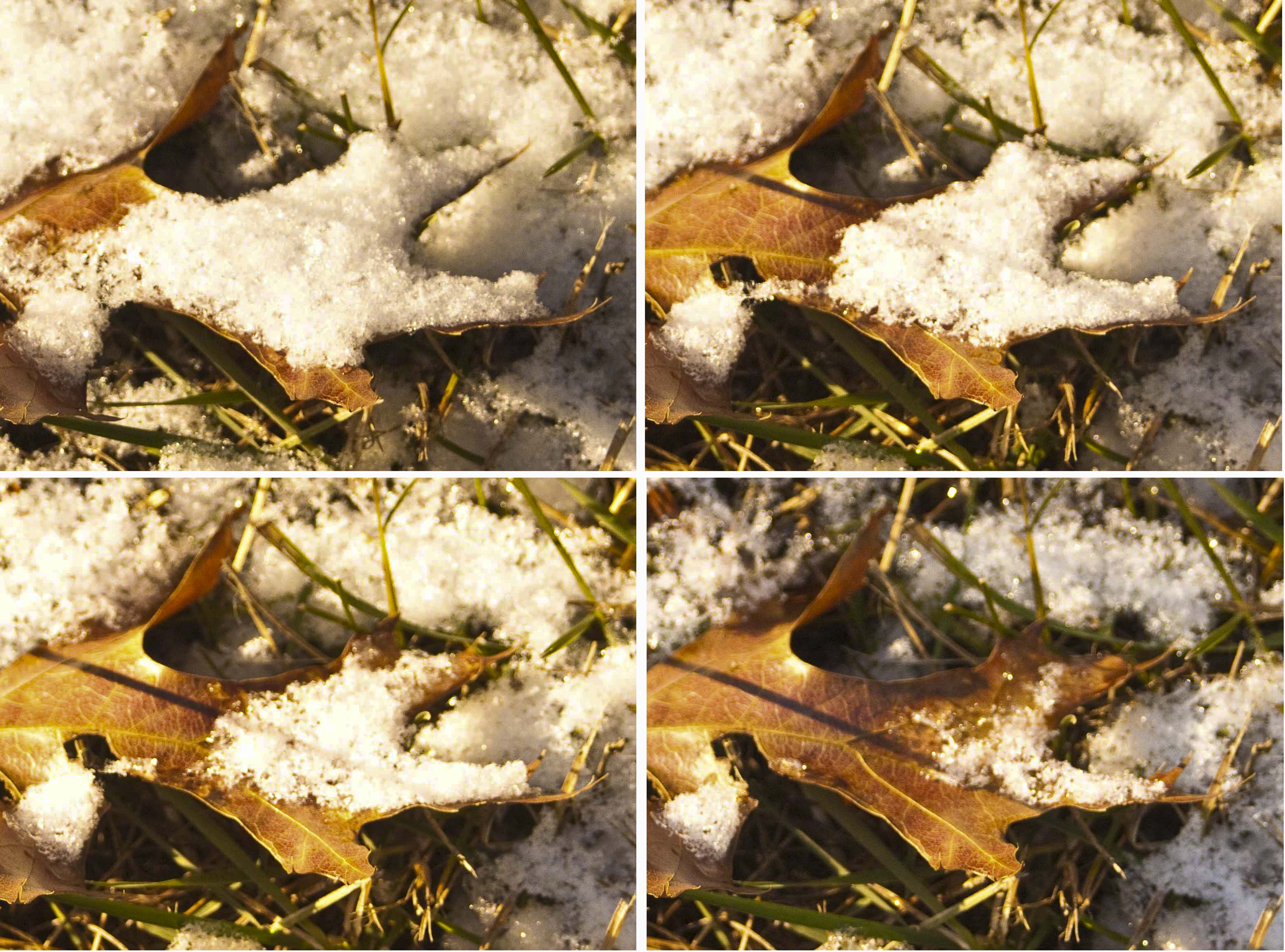 Friends, my father was easily bored after a winter of under-snowing, in other words, a winter that did not produce enough snow to ski, but too much snow to go play golf. This winter was such a winter. I remember him looking out the picture window and proclaiming that the season was “as exciting as watching snow melt”. So i made this time-lapse sequence of snow melting on an oak leaf. Since i do not want to upgrade my account to show you the video, I made this panel of four images (tetraptych) to show you the exciting winter up north. til Tomorrow MJ