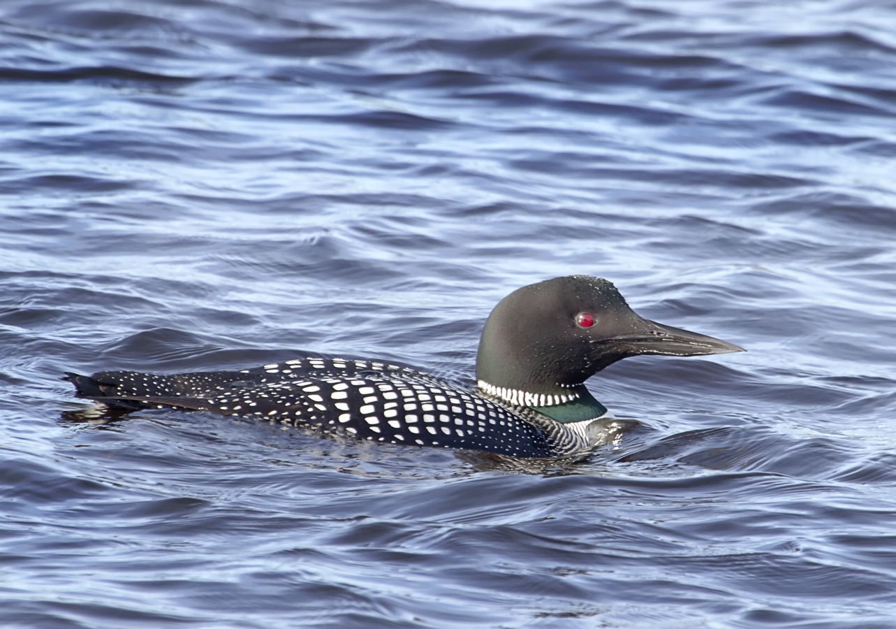 Friends, this black bird is a Common Loon, but he is far from commonly found. He and she only nest on lakes with no acidity, wilderness birds that rely on clean water and fresh air. They are difficult to photograph unless the light is directly on them, because their dominant color is black and a very dark green on their heads. When they are diving for food, they sit very low in the water. This one fishes in a channel where he passes very close to the road. We thank him for the wonderful image and move on, soon the loon couple will be carrying a chick on their backs as they swim the lake. til Tomorrow MJ