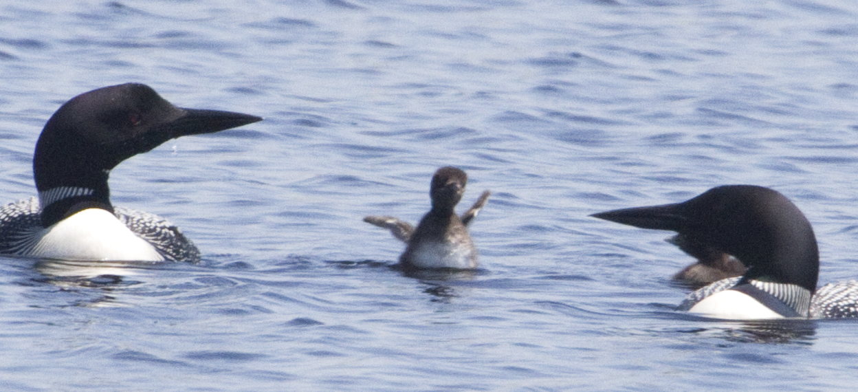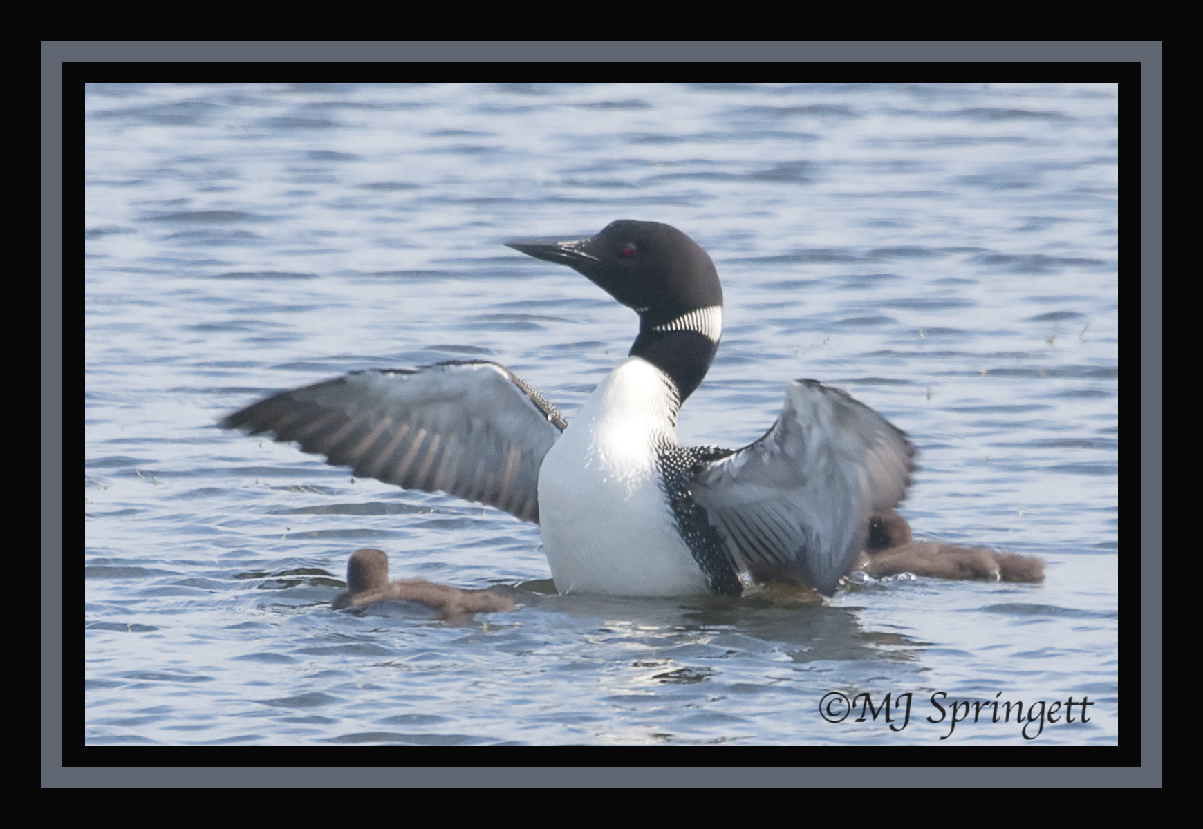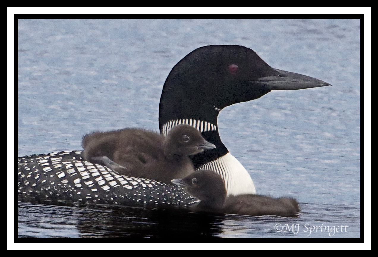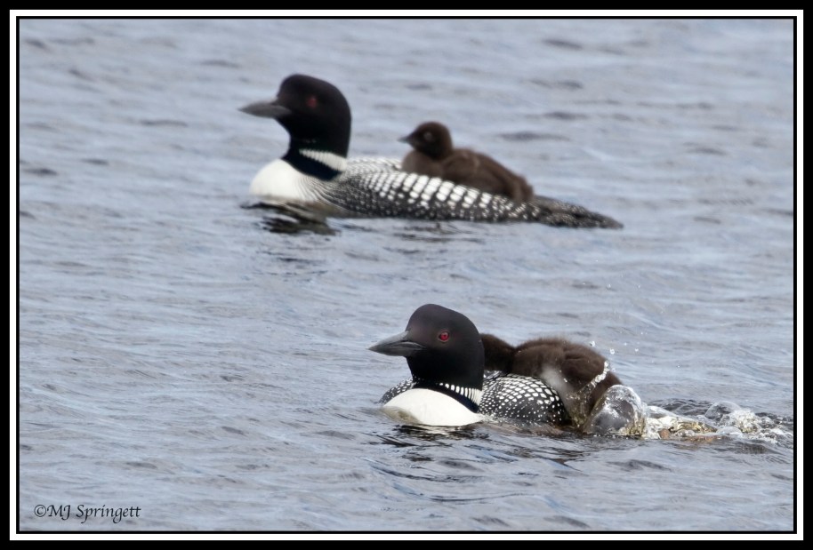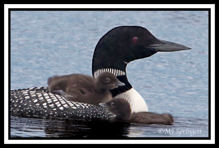 Friends, these loon chicks stick close to an adult bird for protection from osprey and snapping turtles. They are also dependent on the adults for food. Both adult birds take turns babysitting and feeding the chicks and they grow very fast. But for several weeks they ride piggy-back and enjoy the spring sunshine. Good thing they are cute and cuddly, not hard to keep them close, til Tomorrow MJ