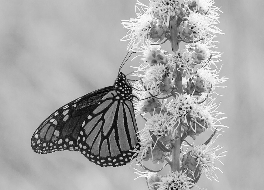Friends, a very common orange monarch butterfly on purple/pink blazing star, i really dont like these colors together, i think they clash as my mother used to say when i would try to wear these colors as a teenager. I know that clothing theory is foreign to todays’ youngsters, but in my days it was a taboo if you wanted a sophisticated look. But I still don’t like these colors together, is the answer to present this image in black and white values. I like it better, what do you think? the black and white is below, til Tomrrow MJ