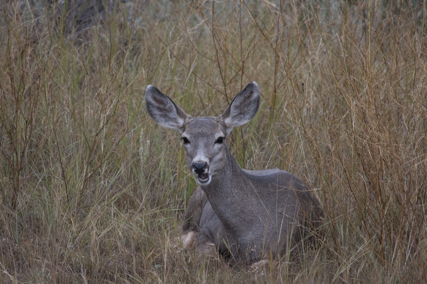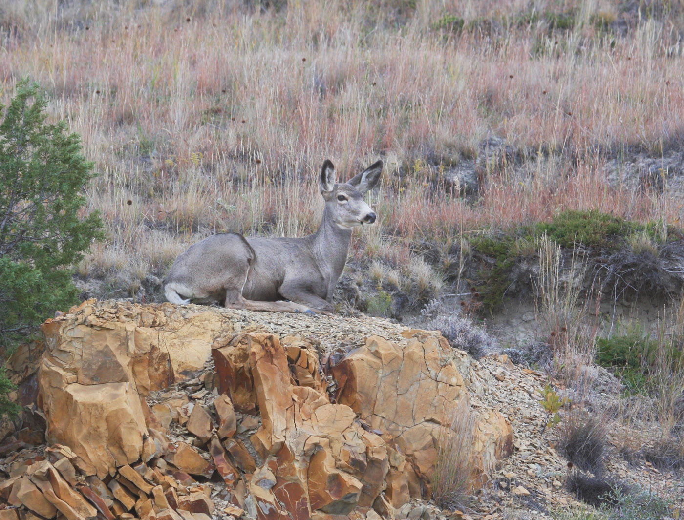 Friends, this big-eared mule deer doe is relaxing in the grasses of the badlands. She is chewing her cud and checking out the photographer. One of the characteristic traits of these deer are the large ears hence their name, mule deer with mule ears. The image below is a fall image of a fawn that was born in the spring, if you look closely you can see remnants of his spotted coat. til Tomorrow MJ