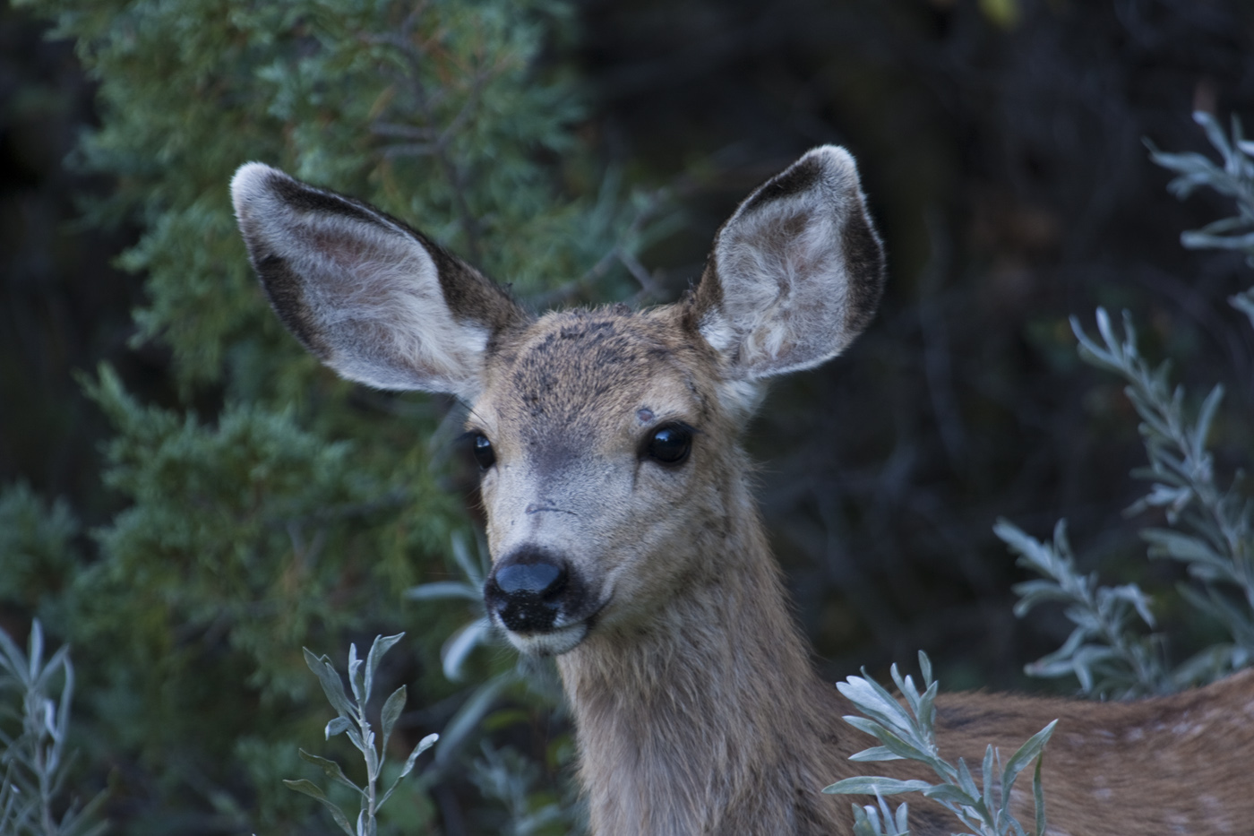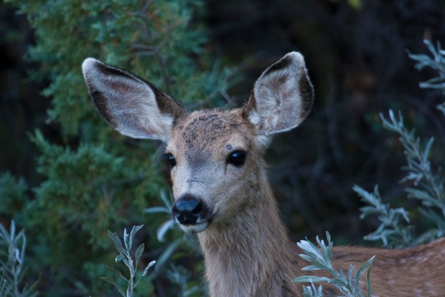 Friends, Mule Deer are everywhere if you look up into the rocky slopes and down into rabbit brush filled ravines. They often lay down in the day light hours, but along toward sunset, they are roaming everywhere. Driving through the National Park after 5pm, if you don’t see deer, you are not looking very hard. til Tomorrow MJ