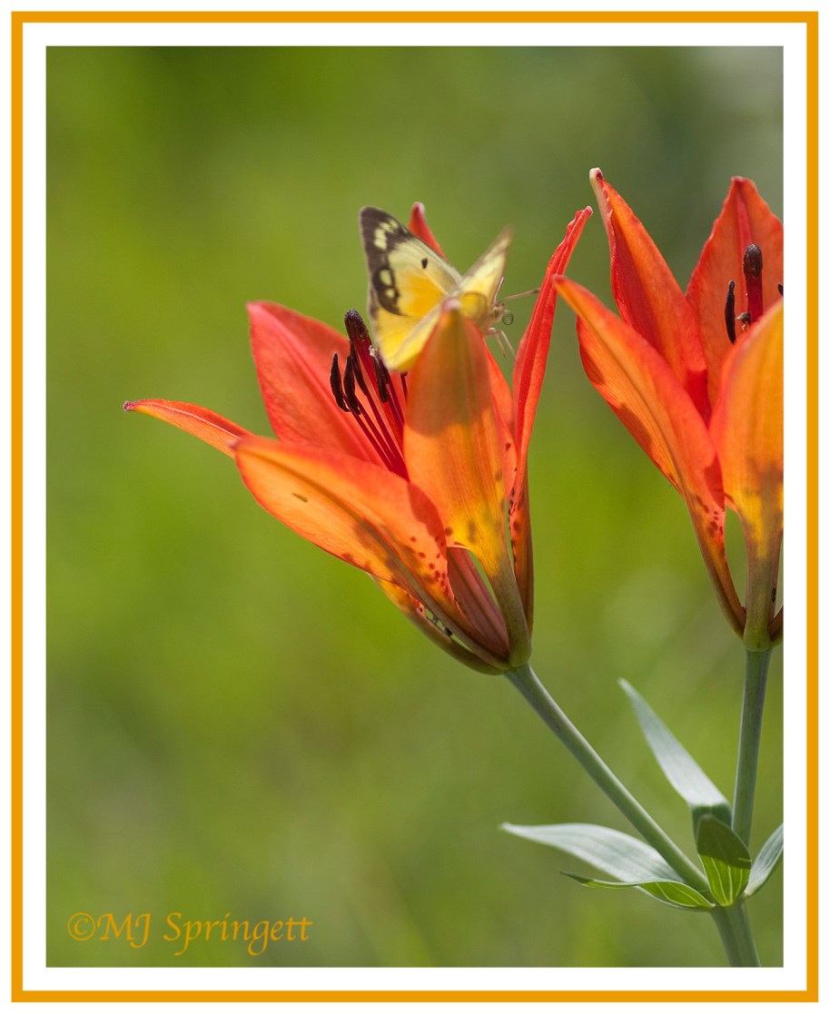 Friends, In the early morning light, the Wood Lilies are so nice with backlighting. With this bloom I got a bonus, a yellow butterfly also liked this bloom that I was photographing. I like that you can see his circular proboscis and antenna on his head. Sometimes the unsuspected details make the image more compelling. These Lilies are common on the sandy pine barrens of the Namekagon Barrens Wildlife Area, a new area for my photography. The Namekagon River runs into the St. Croix River and they are both part of the National Wild and Scenic Rivers network. A real wilderness area where canoes rule!, til Tomorrow MJ