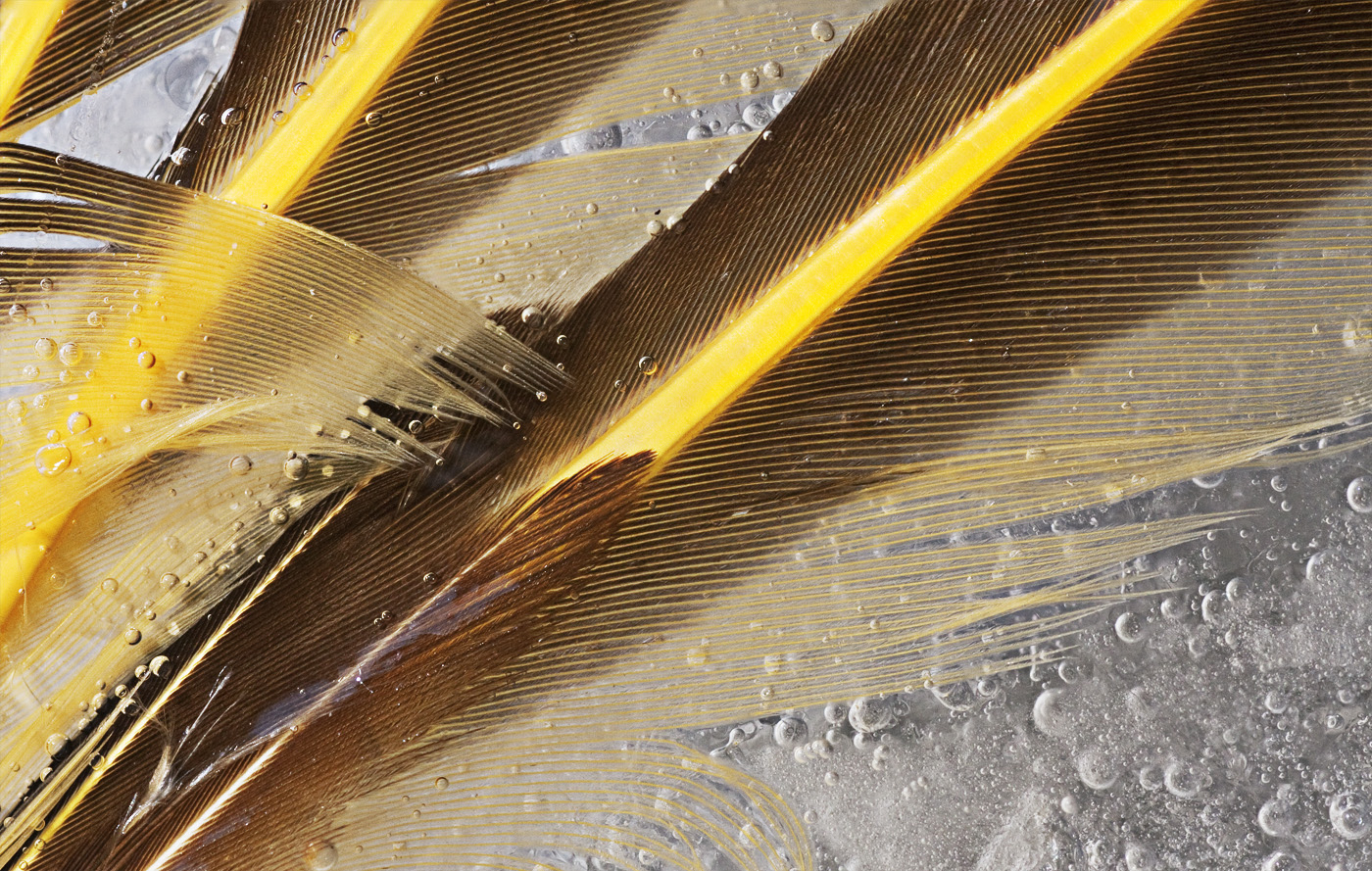 Friends, more bird (Northern Flicker) feathers in ice. Using the same technique as in a previous post these feathers were frozen in ice. In a single image, the whole field was not focused as the feathers were on different planes. Multiple images (8) with different focus points were taken and combined as layers in a single photoshop image. Briefly all the layers were selected and the two commands auto-align layers and auto-blend layers were run sequentially from the edit menu. This process combines the images with layer masks that only allow the focused region to be part of the overall image. I love the bright yellow shafts and the small details that show up in the feathers and in the ice.