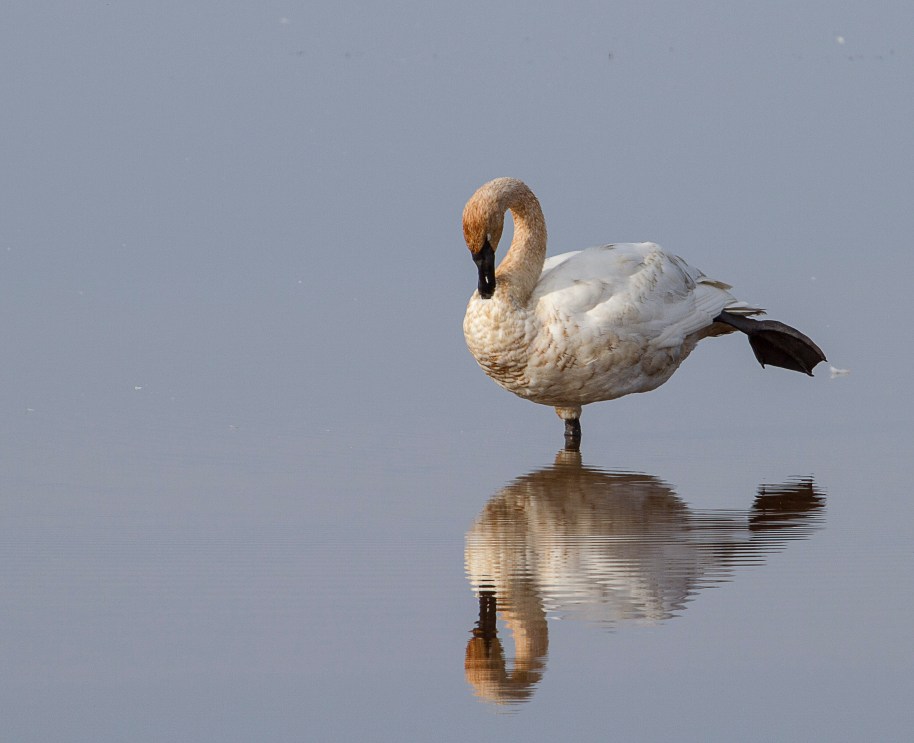 Friends, this morning we are back at Crex Meadows in Northwestern Wisconsin, where the Trumpeter Swans are passing through on the migration. This beautiful bird is preening her feathers and admiring her fine figure in the lake water. A ballerina balanced on one foot, all she needs is a tutu, this week has been a bit gray in the meadow and we are out walking the young dog and mourning the passing of our old dog. The Meadow colors make life a bit more bearable. Below is an image of the grass colors and the pond where thousands of Sandhill Cranes and Mallard ducks are also gathering to help with the harvest of wild rice. til Tomorrow MJ