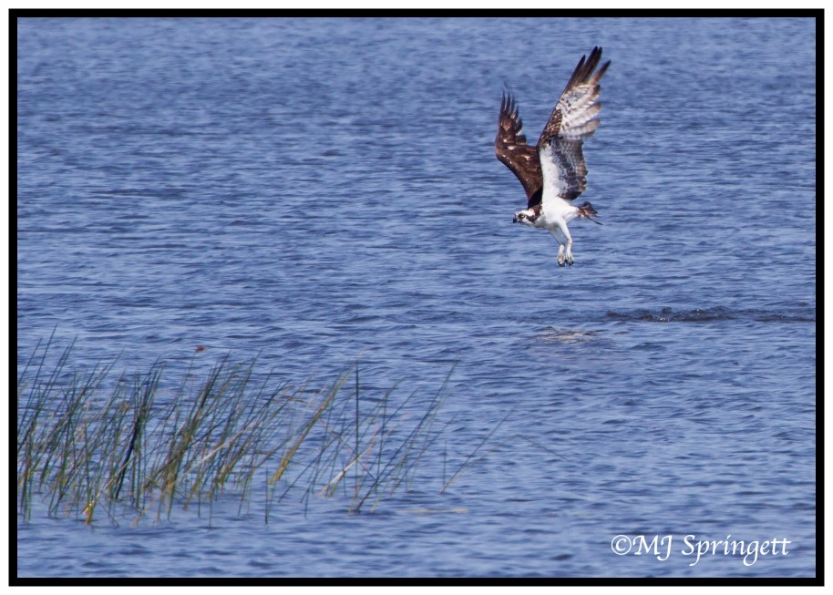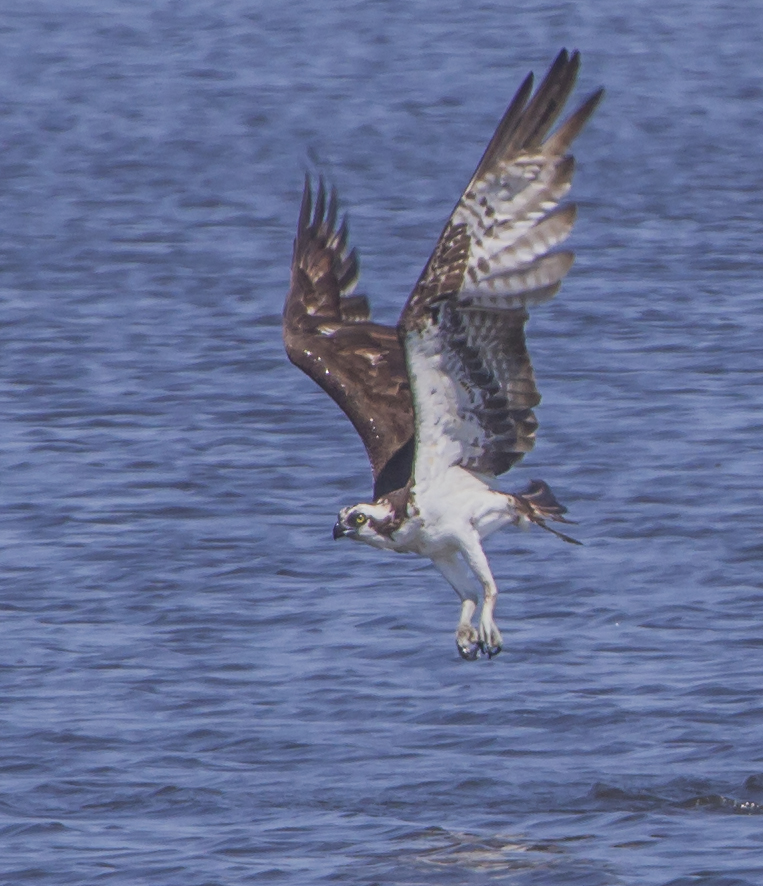 Friends, this beautiful bird is a mature Osprey, as large as an eagle but much prettier in his white markings. Like the Bald Eagle, they eat primarily fish so he has dived talons first into the water but missed his fish. I was watching to see if he would dive on my baby loons who have drifted away from the adults, but he was more interested in what was under the surface. My loons were safe for another afternoon. In the image below you can see his detail and empty talons. til Tomorrow MJ