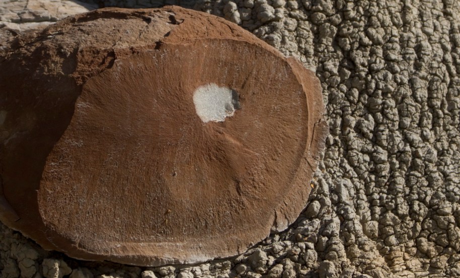 The most interesting are the cannon balls that are 2-3 feet in diameter that are present in the Northern Little Missouri Badlands. In the southern badlands, smaller cannon balls are often being exposed on slopes of bentonite that has a popcorn texture when dry. The bottom photo shows a cross section of a small cannonball that has a white nodule in the interior. til Tomorrow MJ