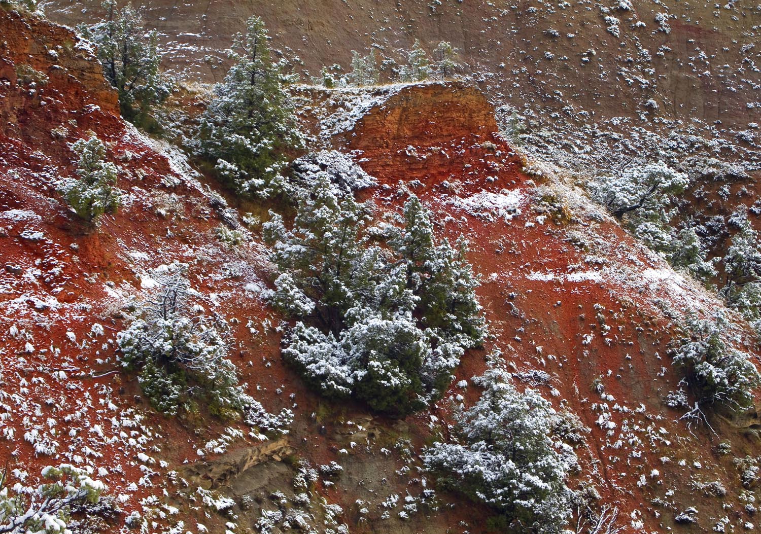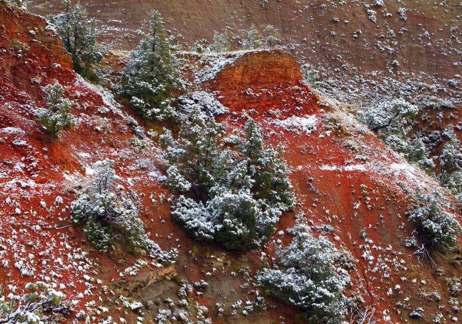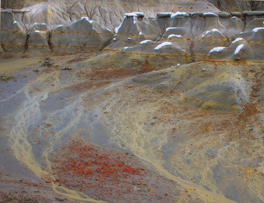 Friends, I like to call this image “rivlets”, i know it isn’t a proper geological term, but it describes what i see. These little rivlets are not yet rivers, but still display the properties of rivers. The yellow stream on the left shows a braided formation while the middle shows a more meandering stream. Both rivlets are washing yellow sediments downhill following the path of least resistance and going around the harder scoria (red) deposits as they are very resistant to erosion by water. The toadstool formations near the top of the image show the results of erosion on layers of differing densities and hardness. I love the colorful patterns after a rain or in this case, a snowfall, melting and running downhill. til Tomorrow MJ