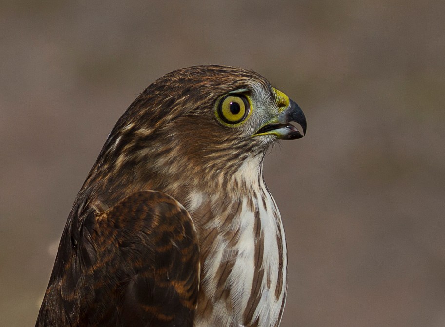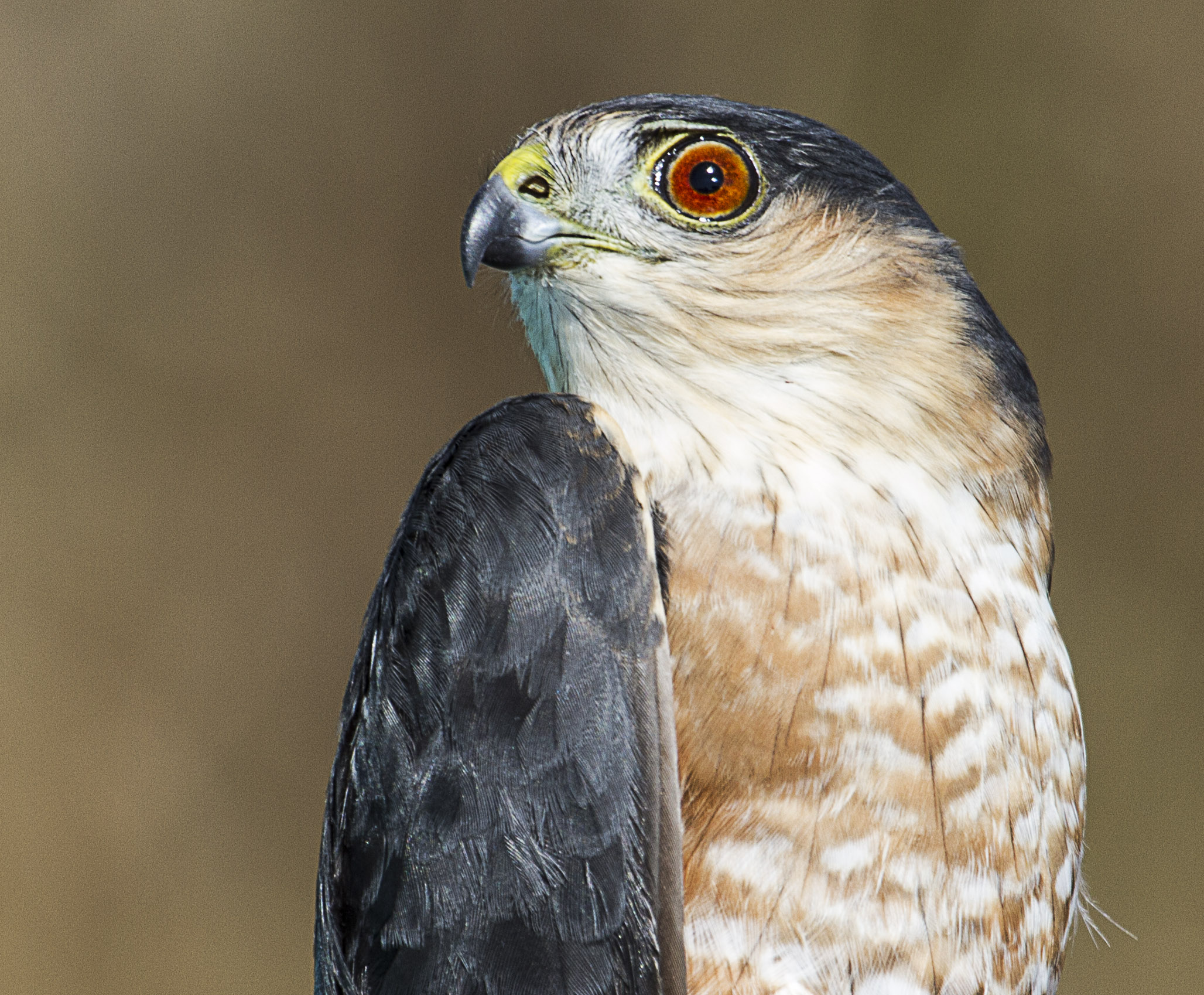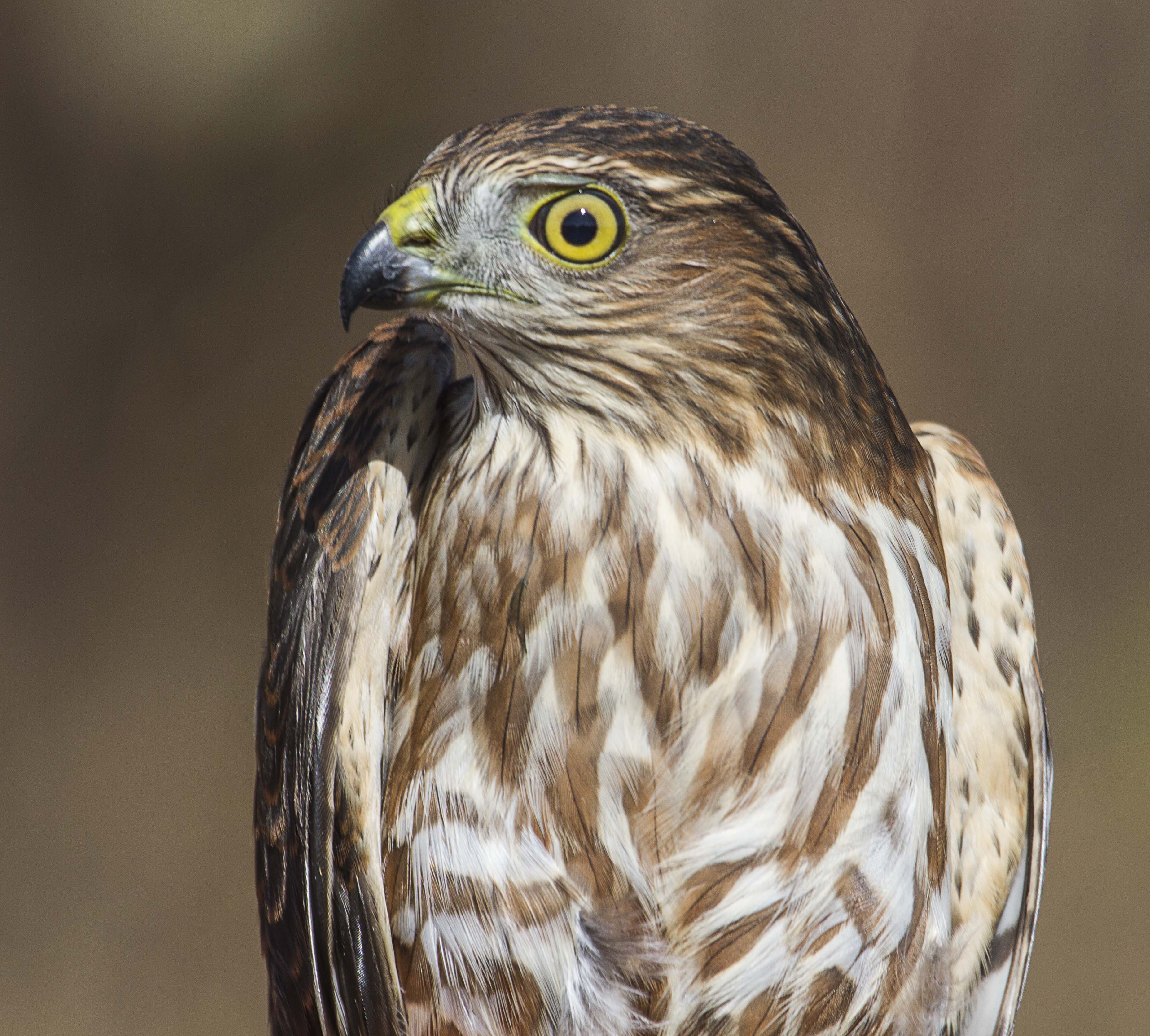 Friends, these two images show the maturation of a sharp-shinned hawk. The left image is a first year chick that was hatched in June and the bottom image shows a two or three year old bird. Three dramatic changes can be compared on these birds. The first is the differences in eye color from the juvenile yellow to orange and red of more mature birds. Secondly, the vertical bars on the chest of the younger bird changes to a more horizontal barring on the mature bird. And third, the chocolate brown of the juvenile changes to a deep gray on the adult bird. That is your hawk lesson for today til Tomorrow MJ
