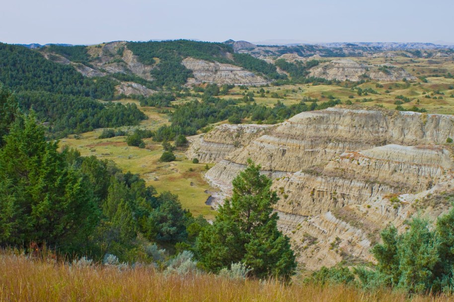 Friends, I have often heard people describe North Dakota as barren and containing no trees. Well that may be true of some parts of the state, but this image shows the badlands with plenty of trees. They are evergreens, cedars and junipers, and keep the green all winter. The northern slopes are usually covered in green, while the south-facing slopes are often bare. In the autumn, the fall colors are apparent in the gullies and along the Little Missouri River. More badlands tree images tomorrow, til Tomorrow MJ