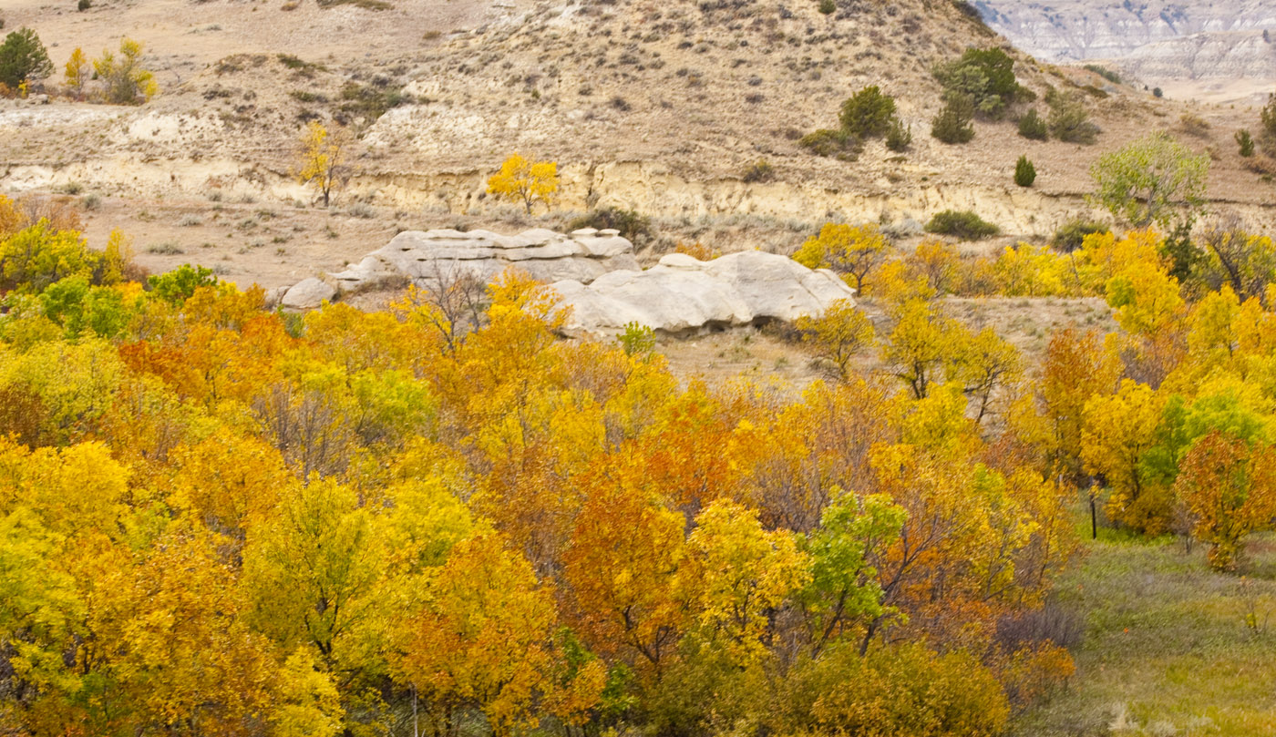 Friends, I know it is spring, but I was blogging about the badlands trees, and of course, fall is the time of year when you notice the deciduous trees in the badlands because of the lovely fall colors. Lots of Cottonwood trees along the Little Missouri River, are bright yellow with the Ash, Elm and Box Elder lending their special hues from the smaller gullies. The above image is a typical grove showing the diversity of colors present in the fall. The bottom image are the cottonwoods along the river. til Tomorrow MJ