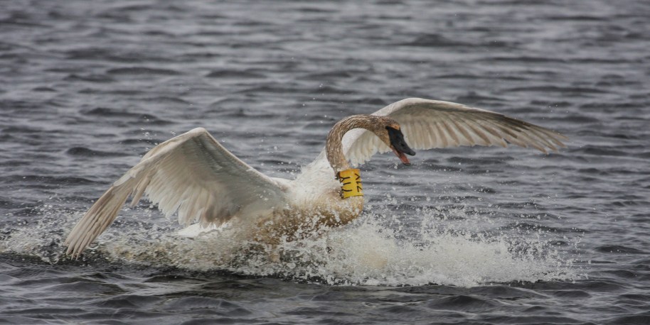 Friends, this is Trumpeter Swan 47E and i think he/she woke up cranky. As these swans were settling into their nightly roost, there was lots of chasing and jostling to vie for space. After about ten minutes of this activity all were quietly preening and tolerating the presence of others. Not your typical swan image but tells of behavior not often shown, I love the feathering on the underside of the wing, til Tomorrow MJ