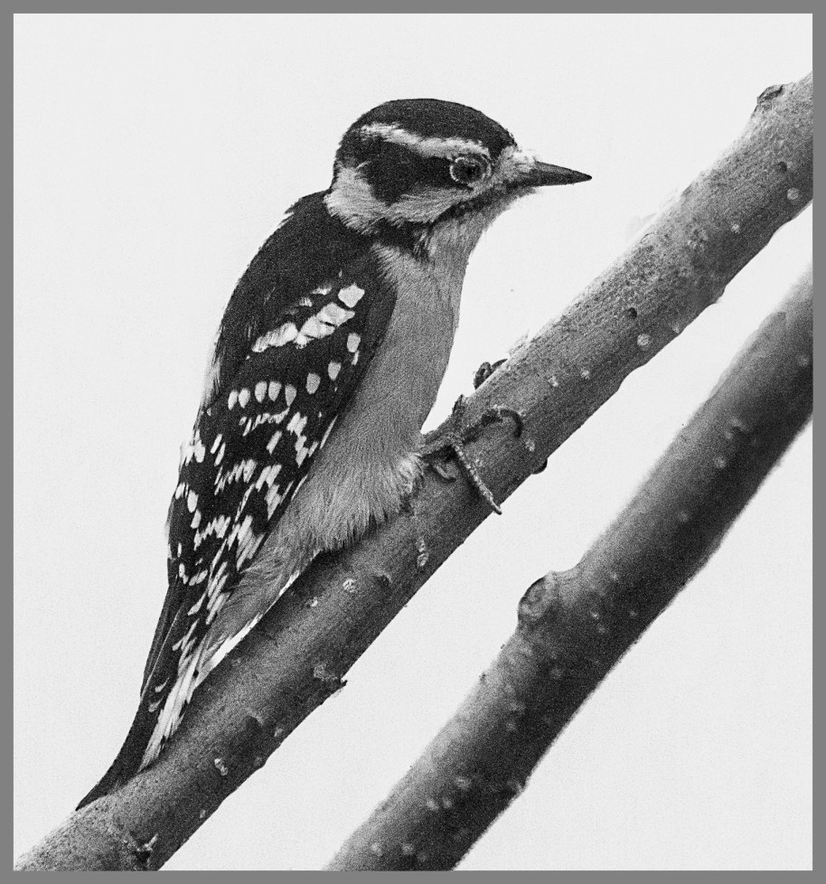 Friends, this is a downy woodpecker who is perched on a bush along the mighty Mississippi River. This image had no color hence the black and white treatment. I photographed this tiny bird while visiting with a friend in Red Wing Minnesota. This friend is one of the few that i can really photograph with, cause we go separate directions and get lost in our respective visions for an hour or more. Depending on the weather, we eventually meet at the vehicle when we have finished. I am always surprised at the subjects that i choose to photograph as opposed to what she chooses. I am always centered on birds and on this particular day, she was focused on bittersweet, hope she got some good ones. til Tomorrow MJ